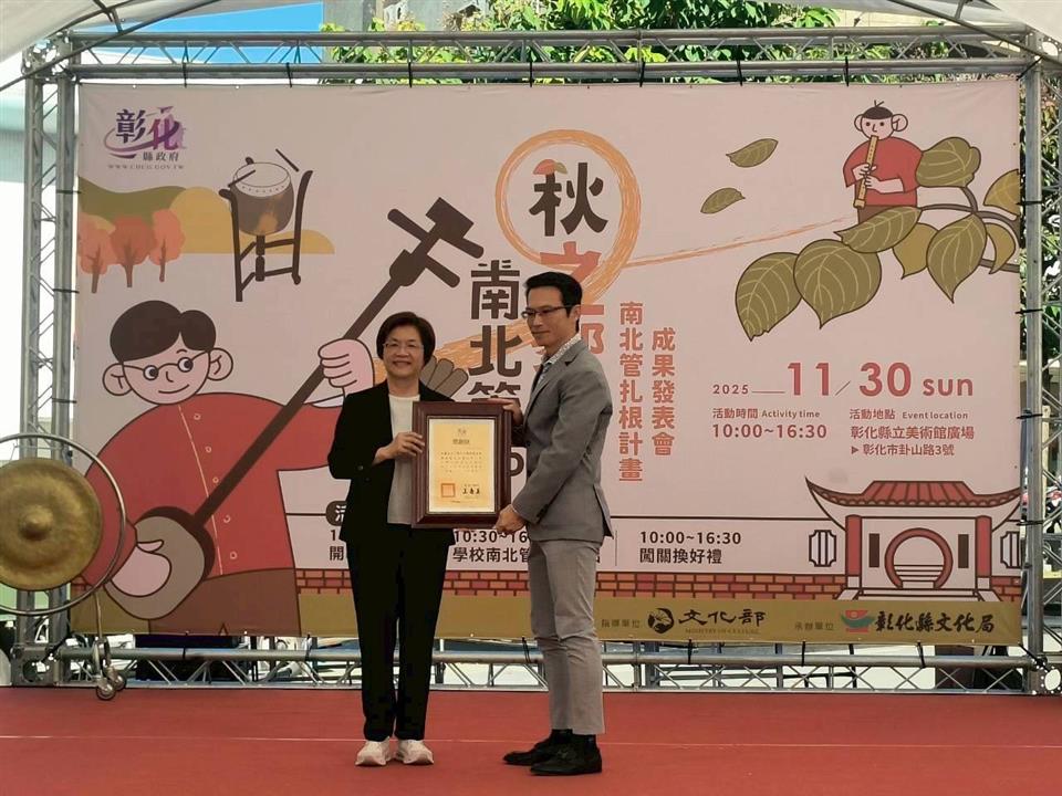 南北管是彰化縣最具在地特色的傳統音樂,彰化縣政府深耕「南北戲曲教育扎根計畫」9年,每年並邀請南北管扎根學校參「南北管秋之饗宴」演出,今年活動於今(30)日在彰化縣立美術館廣場舉辦,共有來自全縣16所學校及彰化縣立青少年南北管實驗樂團共同演出。彰化縣長王惠美親自頒發感謝狀給長期贊助學校南北管教育的財團法人千朝文化藝術基金會董事長陳維仁、積極推動傳統藝術教育的學校王縣長表示,今年的南北管秋之饗宴規模為歷年之最,展現多年來縣內南北管教育的扎根成果與傳承能量,讓民眾在深秋時節聆聽最動人的傳統樂韻。 王縣長表示,傳統文化的保存不僅需要政策推動,更需要學校、家庭與社會的共同支持。感謝各校師生的努力、家長的肯定、以及企業的贊助,讓南北管教育在彰化生根、開花、結果。期盼透過「南北管秋之饗宴」的年度成果展演,讓更多民眾感受傳統音樂之美,並持續支持在地文化扎根,讓古老音樂在現代社會中綻放新生命。 活動由彰化縣立青少年北管實驗樂團揭開序幕,以鏗鏘鼓樂展現青春氣勢。開幕典禮後,各校社團陸續登台演出,節目內容豐富多元,充分呈現學生的學習成果與創意演繹。特別值得一提的是,鹿江國際中小學南管與北管社團首度創新聯合演出「鹿港映象」,此由宏碁集團創辦人施振榮發起的「鹿港映象」交響詩創作計畫,以音樂描繪鹿港的人文風情、藝術氣息與豐饒物產,本次演出由國小部北管社團同學以台語朗誦、國中部南管社團伴奏,為活動注入鹿港風情、帶來地方文化交流,並展現傳統音樂創意演出的新風貌。除了舞台表演外,活動現場亦設有南北管闖關得好禮互動遊戲,共設五個關卡,讓民眾透過趣味挑戰認識南北管樂器、曲調及表演特色,寓教於樂,適合親子共同參與,感受傳統音樂的魅力。 文化局表示,南北管是臺灣傳統音樂的瑰寶,彰化縣更是北管重鎮、南管重心。為延續這份文化資產,推動校園傳習扎根計畫以來,已串聯全縣多所中小學,讓孩子從小親近傳統音樂,學習藝術涵養與團隊精神。此計畫也獲得財團法人千朝文化藝術基金會連續7年贊助與協助,使學校得以持續聘請南北管藝師入校授課,確保教學品質與傳承深度。 與會人員有立委謝衣鳯、縣議員温芝樺、黃千宴、彰化縣文化局長張雀芬、各級民代與地方仕紳等。