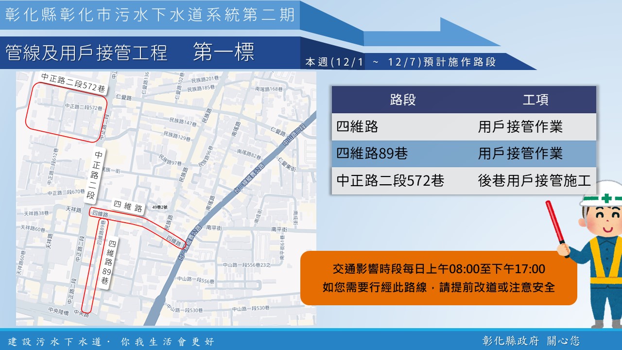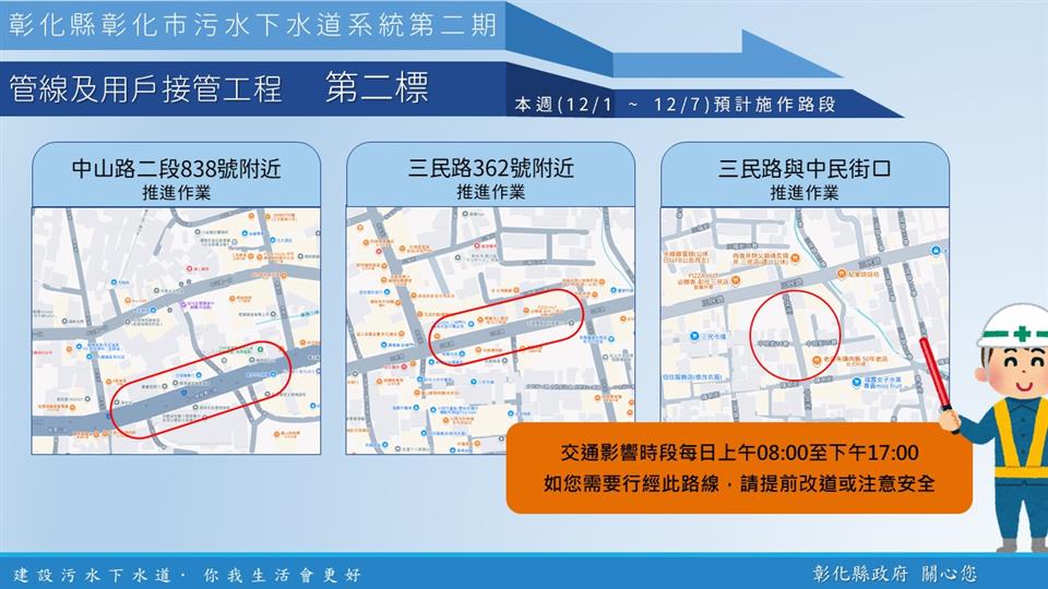 內政部國土管理署下水道工程分署於彰化市區正進行彰化市污水下水道系統管網工程,於三民路、中正路、中山路等重要市區道路進行施工,本週各區施工工項及路段如下,相關期程將視施工情形調整,部分路段實施車道分流及縮減,用路人可多加留意施工路段,注意用路安全,造成不便之處,敬請見諒! 1、 彰化市污水下水道系統第二期管線及用戶接管工程第一標 ,於四維路、四維路89巷,進行用戶接管作業;於中正路二段572巷,進行後巷用戶接管施工作業。 2、 彰化市污水下水道系統第二期管線及用戶接管工程第二標,於中山路二段838號附近、三民路362號附近、三民路與中民街口,進行推進作業。 3、 彰化市污水下水道系統第二期管線及用戶接管工程第三標,於中正路二段(近陳稜路),進行推進作業;於中山路二段(近南校街) ,進行佈場及推進作業。