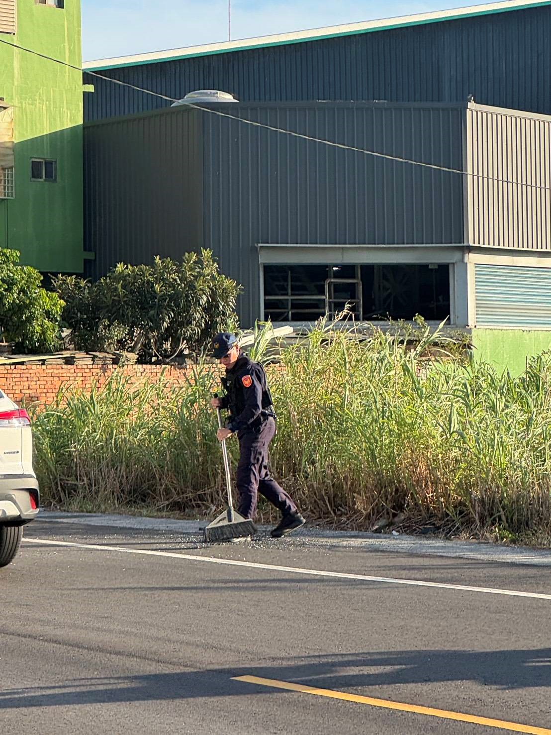 民眾因未注意車前狀況而發生交通事故導,致車窗破裂玻璃散落一地,讓路過之人車險象環生,員警獲見狀於受理結束後即主動協助清除,遏止可能發生之危害。 鹿港分局頂番派出所警員鄭任育,日前執行轄區巡邏勤務時,於15時22分許接獲通報鹿港鎮彰頂路附近,有車輛發生交通事故,地上玻璃散落一地致路過此處之人車均要閃避易發生危險,員警受理後立即趕往事故現場,除立即排除事故現場讓道路恢復通行,惟現場散落大量玻璃碎片,恐影響行車安全,鄭員立即向附近居民借掃把將玻璃碎片清理乾淨後才離開,事後附近居民及路過民眾對於警察主動協助處理及熱心感到非常窩心讚賞不已。 本案警員鄭任育處理事故態度積極、敏覺性高、能及時給予處理,發揮同理心精神,能感同身受民眾可能發生之危害,民眾對警方作為表達高度肯定與感謝,充分提升警察正面形象,足為同仁表率。