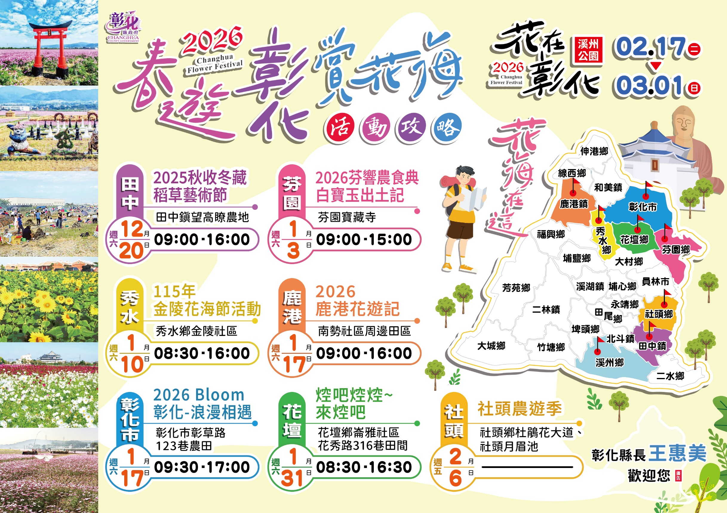 隨著歲月遞嬗,轉眼間來到花海盛開的時節。彰化縣素有「花的故鄉」美譽,每逢冬末春初,百花齊放的景色總令人深深著迷。為活化冬季農地景觀,彰化縣政府多年來持續推動「冬季裡作期間種植景觀作物計畫」,與各鄉鎮(市)公所、農會共同合作,鼓勵農民於冬季裡作期間種植大波斯菊、黃波斯菊、向日葵、百日草等景觀作物,打造兼具農業生產與觀光休憩功能的田園風貌。彰化縣長王惠美誠摯邀請全國鄉親安排假期暢遊彰化,走入花卉綻放的田野,親身感受百花盛開的季節與時光。 114年全縣景觀作物推廣面積達283公頃,其中花海面積達3公頃以上之區域共有彰化市、田中鎮、秀水鄉、花壇鄉、社頭鄉、埔鹽鄉、鹿港鎮、二林鎮、和美鎮、伸港鄉、線西鄉及埤頭鄉等12個鄉鎮市。雖非每處花海皆規劃活動,但農民樂於開放田區供民眾參觀拍照,讓遊客親近農村,留下美好回憶。 「2026春遊彰化賞花海」系列活動由7個鄉鎮市公所及農會接力舉辦,首先由田中鎮農會於「望高瞭」規劃花海專區,設置以稻草製作的「蠟筆小新」、「小小兵」等裝置藝術,與廣闊的波斯菊花海相互映襯,吸引大批遊客前來賞花打卡。接著芬園鄉農會將於1月3日辦理花海暨拔蘿蔔活動,活動邁入第6屆,深受民眾喜愛,今年更擴大開放2公頃農地,提供超過5萬根蘿蔔,讓參與民眾「拔免驚」,收穫滿滿。 後續將由秀水鄉公所「115年金陵花海節活動」、鹿港鎮公所「2026鹿港花遊記」、彰化市公所「2026 Bloom 彰化-浪漫相遇」、花壇鄉公所「焢吧焢焢~來焢吧!」以及社頭鄉公所「社頭農遊季」等活動接力登場,5個公所各自展現不同花海主題與在地特色。活動期間除規劃地方農特產品展售、特色小吃品嘗外,還有抓泥鰍及焢窯等農村體驗活動,並設置稻草藝術與彩燈裝置,讓大小朋友盡情遊玩、拍照留念。 縣府期盼透過各鄉鎮市接續舉辦花海活動,結合地方產業與農村特色,持續深化「彰化是花的故鄉」品牌形象,帶動農村觀光與地方經濟發展。四處綻放的花海如同海岸的波浪般席捲而來,千萬別錯過一年一次的農田花海美景,此外2月17日(大年初一)至3月1日,溪州公園將舉辦「2026花在彰化」活動,誠摯邀請全國民眾於春節期間相約彰化,漫遊壯麗花海、感受繽紛花景,用鏡頭捕捉最美好的春日回憶。