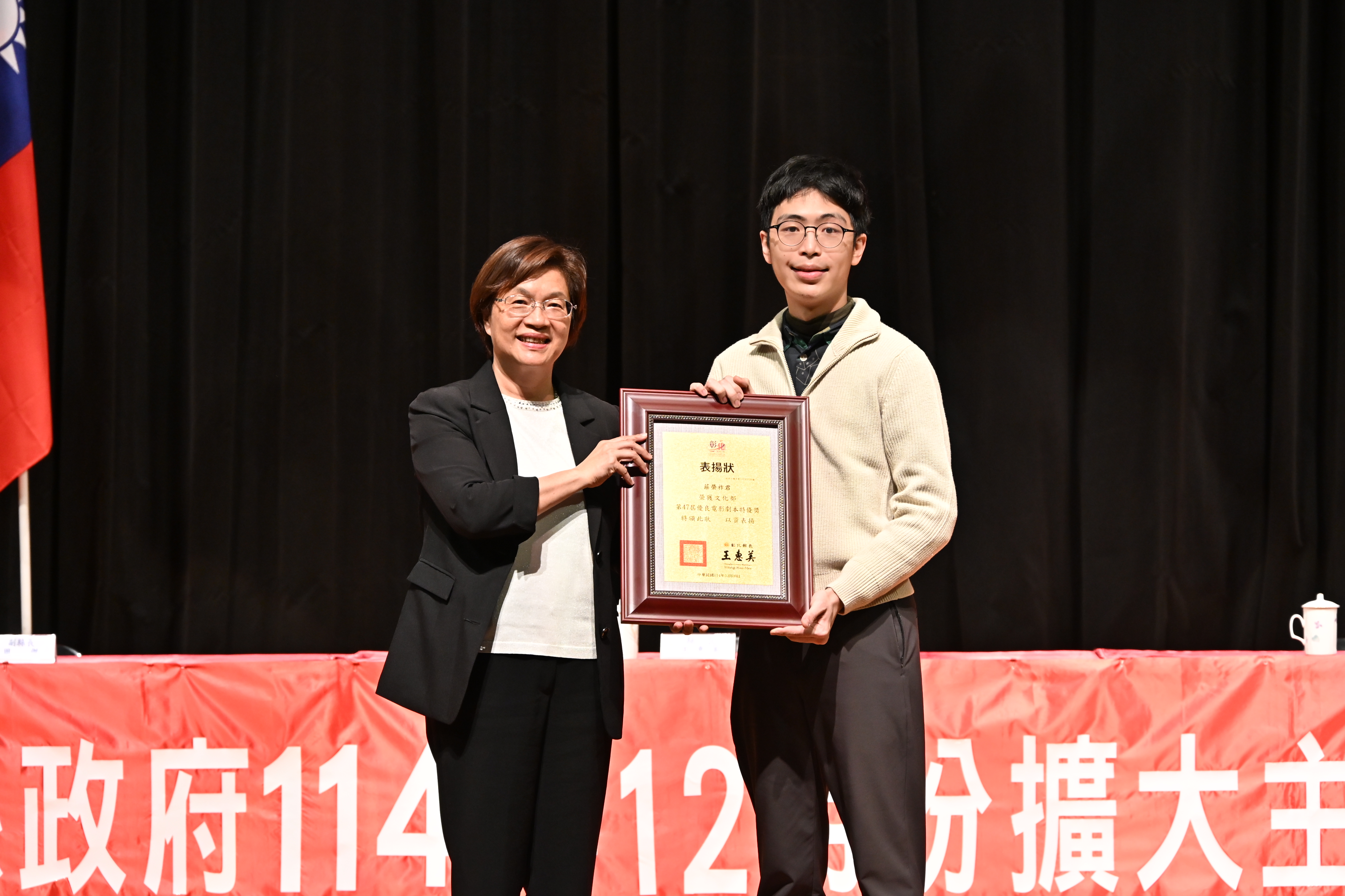 新生代編劇莊榮祚參加文化部第47屆優良電影劇本,他的新作〈爸爸變成了天使回家〉因真摯動人、兼具幻想與情感張力的故事設定,獲得「優良電影劇本特優獎」,展現編劇實力。彰化縣長王惠美於114年12月30日擴大主管會報中頒發表揚狀恭賀莊榮祚先生,以亮眼創作成績為彰化爭光,展現彰化青年在影視創作領域的蓬勃能量。 莊榮祚1998年生於彰化縣田中鎮,畢業於臺灣藝術大學電影系,在校期間即致力以兒童與青少年視角出發,探討親情、成長與生命等主題。在〈爸爸變成了天使回家〉中,他進一步挑戰深刻的情感與人生議題,面對「失去父親」、「傷痛與自我和解」,用深刻且細膩的筆觸構築出一段療癒與希望交織的故事。評審一致肯定其劇本結構完整、角色刻畫真摯、情感張力強烈。 其歷年創作包含短片《遊戲攻略》,以及與蔡岳霖共同編劇之兒童劇集《百味小廚神》,作品橫跨第一季《中元大餐》與第二季《營養午餐爭霸戰》,共十五集,深受觀眾喜愛;另其短片作品《你吹 Do,我吹 Si》(Tutti)入圍今年柏林影展兒童單元 Generation Kplus,展現其在國際影展舞台的創作潛力。 文化局表示,影視與文字創作皆需透過長久的投入與累積,才能孕育出動人的作品,誠摯恭喜莊榮祚先生獲獎!期待這位從彰化出發、懷抱創作夢想的年輕編劇,持續在劇本創作綻放光芒,創造更多動人的作品。縣府團隊也將投入更多資源,打造更好的藝文環境,協助更多影視與文字創作人才在更廣闊的舞台散發出耀眼的光亮。