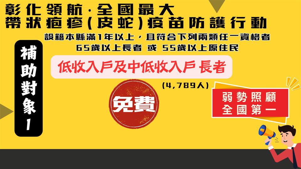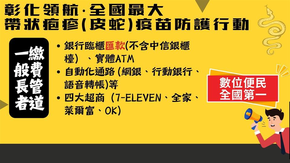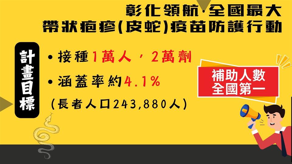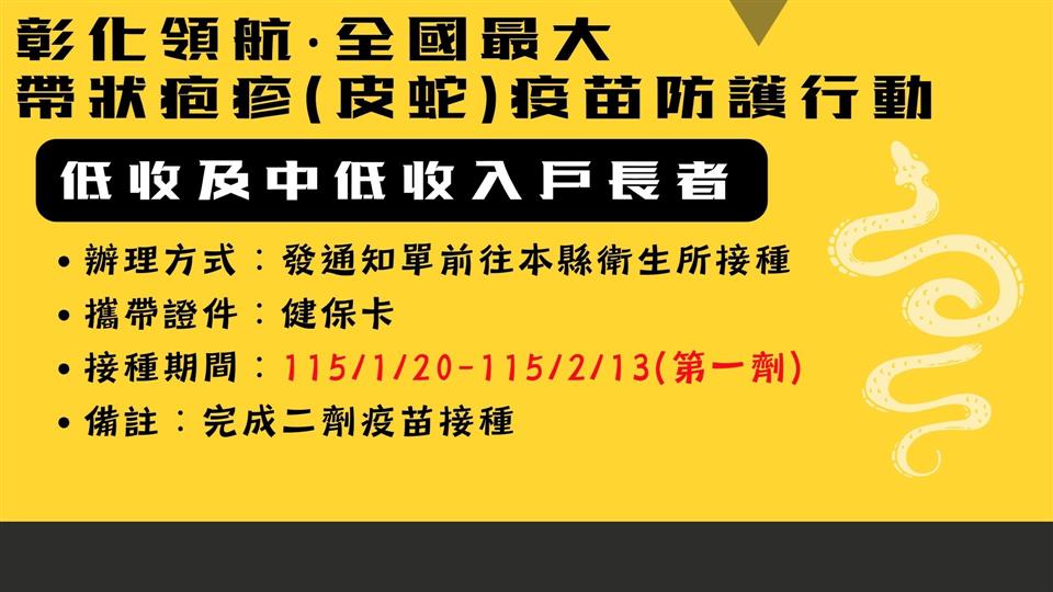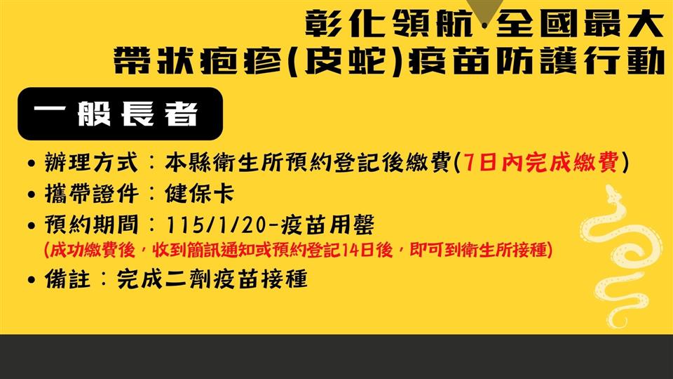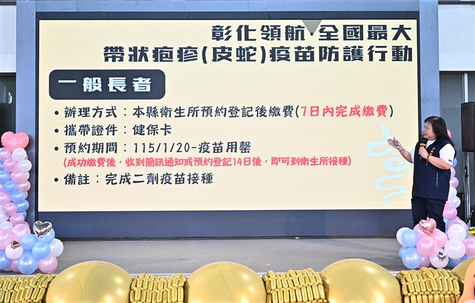 彰化縣衛生局今(31)日上午於縣府1樓中庭舉辦「彰化領航‧全國最大‧帶狀疱疹(皮蛇)疫苗防護行動啟動記者會」,宣布115年1月20日將正式啟動全國規模最大的65歲(含原住民55歲)以上長者帶狀疱疹疫苗接種計畫,彰化縣長王惠美及國家預防接種諮詢委員會(ACIP)召集人兼台灣疫苗推動協會理事長李秉穎等多位貴賓與會,共同見證彰化在高齡防護政策上的重要里程碑。王縣長表示,為提升本縣長者免疫防護力、降低重症與併發症風險,彰化縣自購2萬劑疫苗,提供設籍本縣一年以上1萬名長者施打兩劑完整保護,低收入及中低收入戶長者免費由縣府全額補助;一般長者則自付6,000元,其餘不足部分由縣府補助。115年1月20日起開放長者至衛生所臨櫃預約登記接種,歡迎長輩踴躍參與,縣府團隊與您一同守護健康,為115年幸福彰化開啟嶄新氣象。 王縣長表示,帶狀疱疹(皮蛇)造成的神經痛往往比外表皮疹更折磨人,不少長者因疼痛甚鉅嚴重影響生活品質,但是自費疫苗價錢昂貴,許多長輩捨不得也負擔不起。縣府為守護長者健康,推動這項高齡健康政策,感謝議長謝典霖及所有議員對預算的支持,也感謝眾多專家學者對本縣公衛的指導與協助。這不僅是彰化高齡健康政策的重要里程碑,更展現彰化縣「健康平等、不分貧富」的施政方針。 王縣長指出,隨著近年高齡人口逐漸遞增,長者年紀越大,身體抵抗力越差,亟須要透過疫苗以維護自身健康。因名額有限歡迎長者提前預約,縣府將持續推動更多貼近長者需求的健康政策,讓「彰化幸福向前行」。 縣議員劉淑芳代表致詞表示,感謝王縣長縣府團隊用心規劃,帶狀疱疹疫苗防護行動可以協助長輩減痛、為家庭減壓,是守護高齡健康、提升公衛防護的重要里程碑。有聽到長輩反應晚上痛到睡不著,白天痛到不敢動,但疫苗價格自費兩劑高達一萬八到兩萬元,是一筆龐大開銷。感謝議會同仁支持其在今年會期中的提案,規劃本縣長者疫苗接種計畫,誠摯邀請符合資格的長輩踴躍接種疫苗,讓每位長輩都享有健康保障。 國家預防接種諮詢委員會(ACIP)召集人兼台灣疫苗推動協會理事長李秉穎表示,帶狀皰疹(皮蛇)會導致神經痛,而且與心血管疾病相關,包括中風、心肌梗塞、失智等疾病,所以其實這支疫苗的價值是被低估的,恭喜彰化縣跨出全國首創的第一步。 ACIP委員暨國立臺灣大學公共衛生學院教授陳秀熙表示,感謝王縣長縣府團隊的用心,接種帶狀疱疹(皮蛇)疫苗可以提升成人的身體免疫力,同時可以預防心血管疾病及降低失智機率,維護身體健康並保障生活品質,這是全台在成人健康防護上的重要里程碑。 衛生局表示,依據114年11月彰化縣戶籍人口資料顯示,65歲以上人口已達245,785人占全縣人口20.29%,本次萬人接種補助計畫不僅回應高齡健康需求,也象徵本縣向「健康老化」跨出重要一步。本接種計畫由全縣27個鄉鎮市衛生所臨櫃預約及接種,低收及中低收入戶長者由衛生局事先寄發紙本通知單,並於1月20日至2月13日持通知單到衛生所確認資格無誤後完成第一劑接種;一般長者於1月20日起至衛生所預約登記後,由衛生所提供繳費單,透過銀行臨櫃匯款(不含中信銀櫃檯);銀行自動化通路(包含網銀、行動銀行、實體ATM、語音轉帳);四大超商(7-ELEVEN、全家便利商店、萊爾富、OKmart)等門市繳費。成功繳費後長者接到簡訊通知或預約登記14日後,即可到衛生所完成第一劑接種,並提醒民眾本方案繳費後無法退費及轉讓。 帶狀疱疹是由水痘-帶狀疱疹病毒(Varicella-zoster virus,VZV)引起的疾病,俗稱「皮蛇」,大部分都是小時候曾感染水痘,水痘-帶狀疱疹會使病毒潛伏在背根神經節或腦感覺神經節中,免疫力下降時可能再次活化引發帶狀疱疹。帶狀疱疹一般特徵為沿著皮節分布的單側性、疼痛性、水泡性皮疹。急性期皮疹及疼痛持續時間約數周,部分病患會併發帶狀疱疹後神經痛,此併發症疼痛可能持續數月甚至超過一年的時間。其他併發症包含眼部帶狀疱疹,嚴重可能導致視力受損、失明。疾病好發於50歲以上成人、免疫功能低下者或曾經感染者亦可能再次發作,包含人類免疫缺乏病毒感染、癌症、糖尿病、慢性腎臟病、氣喘、慢性阻塞性肺病、類風溼性關節炎、使用免疫抑制劑患者等族群皆為高風險對象。 與會人員有縣議員劉淑芳、温芝樺、白玉如、顧黃水花、黃千宴、許雅琳、凃淑媚、黃俊源、林小琪、賴清美、柯振杯、蕭文雄、凃俊任、張欣倩、劉惠娟、詹木根、蕭妤亘、詹琬惠、吳錦潭、李俊諭、陳榮妹、縣議員陳玉姬服務團隊、彰化縣衛生局長葉彥伯、彰化縣醫師公會理事長蔡梓鑫、國家預防接種諮詢委員會(ACIP)召集人李秉穎、國立臺灣大學公共衛生學院教授陳秀熙、臺中榮民總醫院感管中心顧問陳伯彥、臺北市立聯合醫院緊急醫療部主任賴昭智、新光醫療財團法人新光吳火獅紀念醫院醫務秘書黃建賢、縣政顧問楊曜聰、各級民代與地方仕紳等。