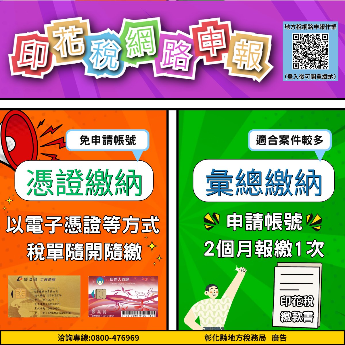彰化縣地方稅務局表示,透過地方稅網路申報作業系統(網址:https://net.tax.nat.gov.tw)開立印花稅應納稅額繳款書及按期申報彙總繳納印花稅,不受時間及空間限制,輕鬆完成印花稅的申報作業,並提供多元化電子支付 (掃描三段條碼)進行線上繳稅,省時、簡單又便利。 稅務局說明,為便利納稅人繳納印花稅,自112年10月1日起已辦理網路開單帳號者,只需1個帳號,即可開立全國各縣市印花稅繳款書,並開放使用自然人(或工商)憑證、已註冊之健保卡,或行動自然人憑證(TW Fido)以手機驗證後即登入免申請帳號,以網路代替馬路,相當方便,納稅人可多加利用。 如果想進一步瞭解相關規定,可以就近到稅務局或所屬分局洽詢,或利用稅務局免費電話0800-47-6969詢問相關事宜。