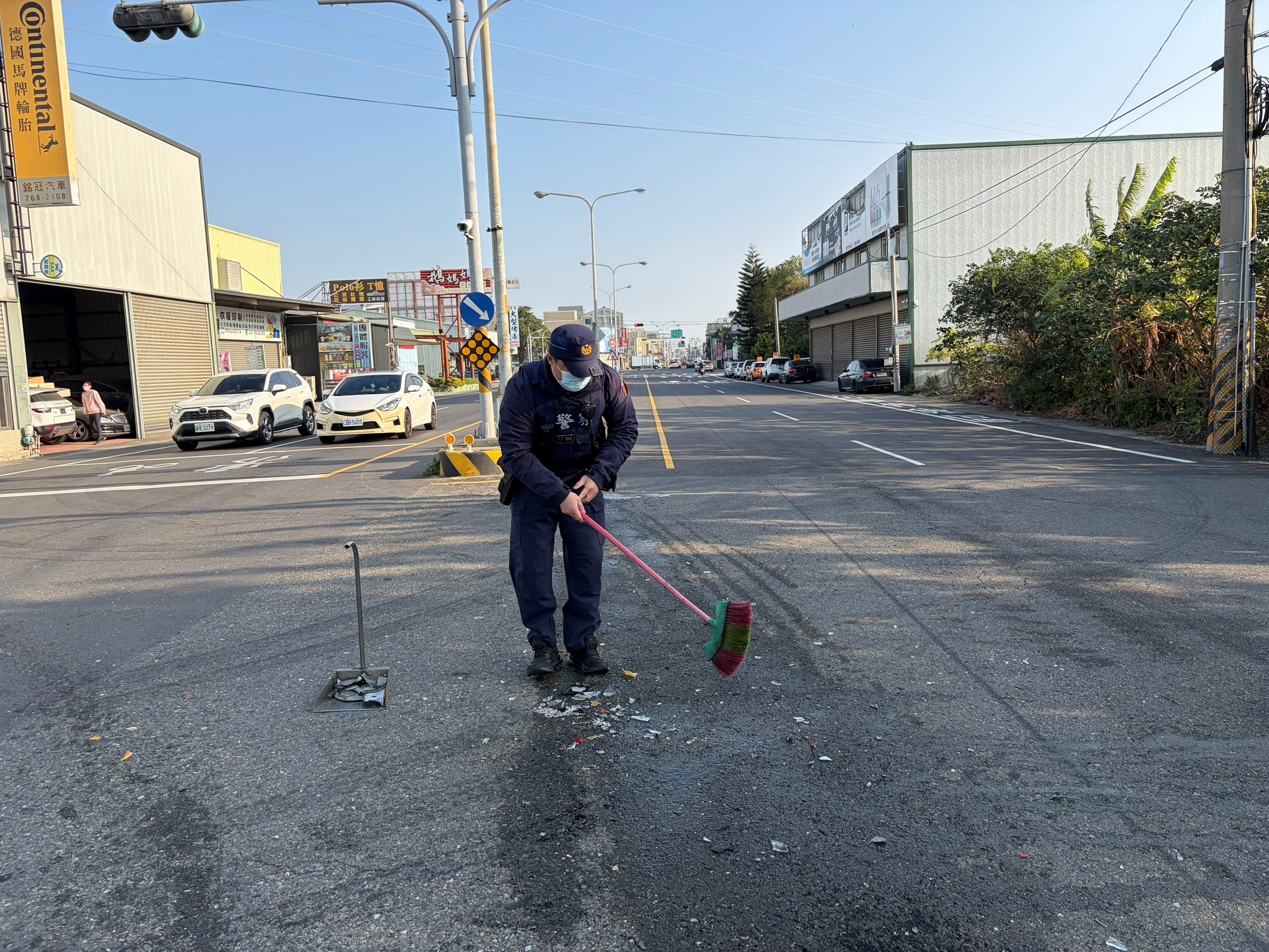 因民眾未注意車前狀況而發生交通事故,導致自小客車車窗及車燈燈罩破裂散落一地造成路過之人車有安全之顧慮,員警於處理車禍結束後,主動及時處理恢復道路通行備受民眾讚許。 鹿港分局秀安派出所警員梁榮特、廖見維,日前執行轄區巡邏勤務時,於8時20分許接獲通報在秀水鄉安溪村彰水路1段與秀安路口有發生交通事故,員警獲報後立即趕往現場處理,經處理完畢道路恢復通行後,見車道上散落一地的破碎玻璃,為避免行經之車輛閃避不及打滑而造成二次交通事故,隨即向事發附近民宅住戶商借打掃器具,使交通恢復順暢,安全無虞後,始離開現場恢復勤務,路過民眾及附近居民見員警此舉,對員警主動、積極態度深表肯定與讚許。 本案警員梁榮特、廖見維處理事故態度積極、敏覺性高、能及時給予處理,發揮同理心精神,能感同身受民眾可能發生之危害,民眾對警方作為表達高度肯定與感謝,充分提升警察的正面形象。