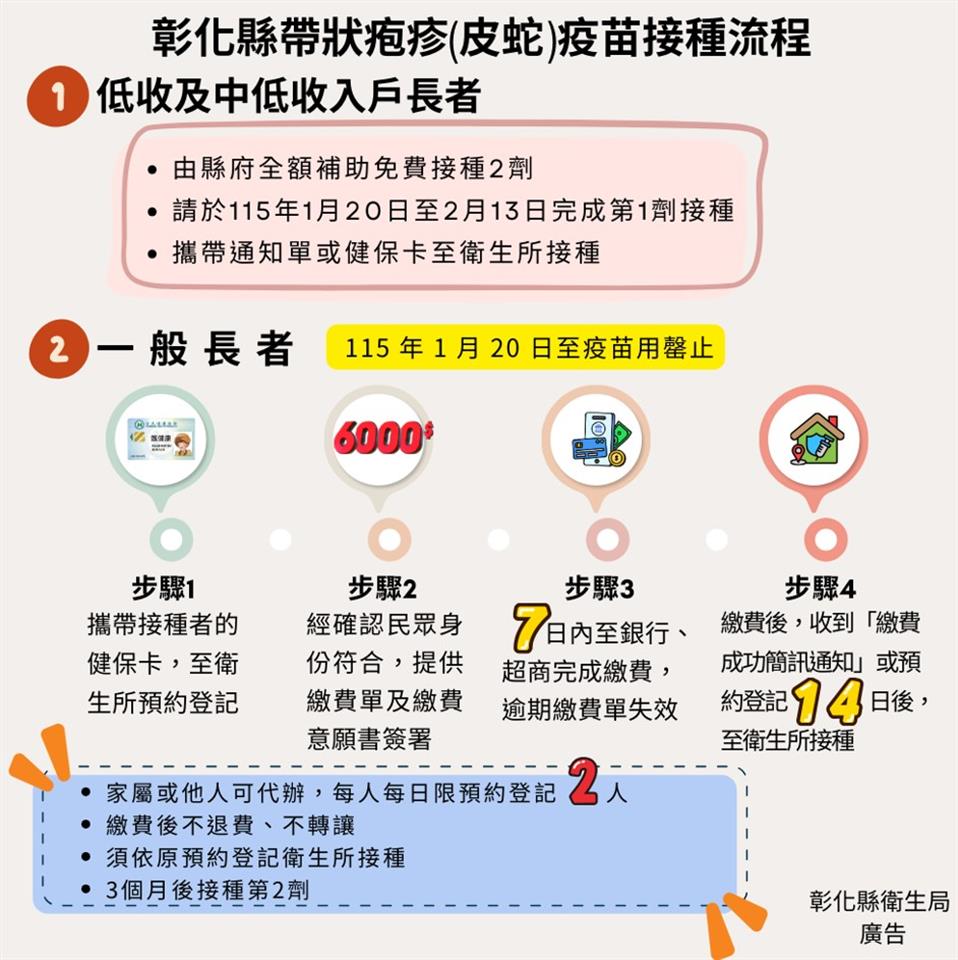 彰化縣政府守護長者健康,帶狀疱疹(皮蛇)疫苗接種計畫將於115年1月20日正式啟動,接種預約預計分五期,若疫苗尚有剩餘,將滾動式加開後續期別。縣府自購2萬劑疫苗,提供設籍彰化縣一年以上1萬名65歲(含原住民55歲) 長者施打兩劑完整保護,低收入及中低收入戶長者免費由縣府全額補助;一般長者則自付6,000元,其餘不足部分由縣府補助。為確保接種秩序並配合作業,本次計畫採「同步開放預約、分批有序接種」模式。彰化縣長王惠美呼籲長者踴躍施打,提升個人保護力,並提醒早晚溫差大,前往衛生所務必做好防寒措施。 分期接種規劃:首週弱勢優先,第二週起一般長者接力 本次疫苗接種依據對象及繳費入帳時程,規劃為五期進行調度。雖然全對象於1月20日起同步開放登記,但實際施打安排如下: 一、第一期 115/1/20至1/23:低收及中低收入戶長者優先接種,憑通知單或健保卡至衛生所辦理;一般長者預約登記領取繳費單及簽署繳費意願書。 二、第二期 115/1/26至1/30:低收及中低收入戶長者持續接種服務;一般長者加入接種。 三、第三期 115/2/2 至 2/6:低收及中低收入戶長者、一般長者持續接種服務。 四、第四期 115/2/9 至 2/13:低收及中低收入戶長者、一般長者持續接種服務(低收及中低收入戶長者接種期限至本期止 )。 五、第五期 115/2/23 至2/26:若疫苗尚有剩餘,滾動式加開後續期別。 衛生局提醒一般符合資格之長者,完成預約登記後須於7日內至銀行或超商繳納自付額6,000元。因需確認繳費資訊入帳,長者請於收到「繳費成功簡訊通知」,或預約登記滿14日後,再前往原預約衛生所接種,避免白跑一趟。近期氣溫轉涼,衛生局特別叮嚀,長者及代辦家屬前往衛生所臨櫃辦理或接種時,請適時增添衣物,注意頭部及手腳保暖,預防低溫誘發心血管疾病。 •接種小撇步: 1.帶什麼:健保卡(低收及中低收入戶長者請加帶通知單)。 2.去哪打:務必至「原預約登記」之衛生所。 3.誰代辦:每人每日預約登記限2人。