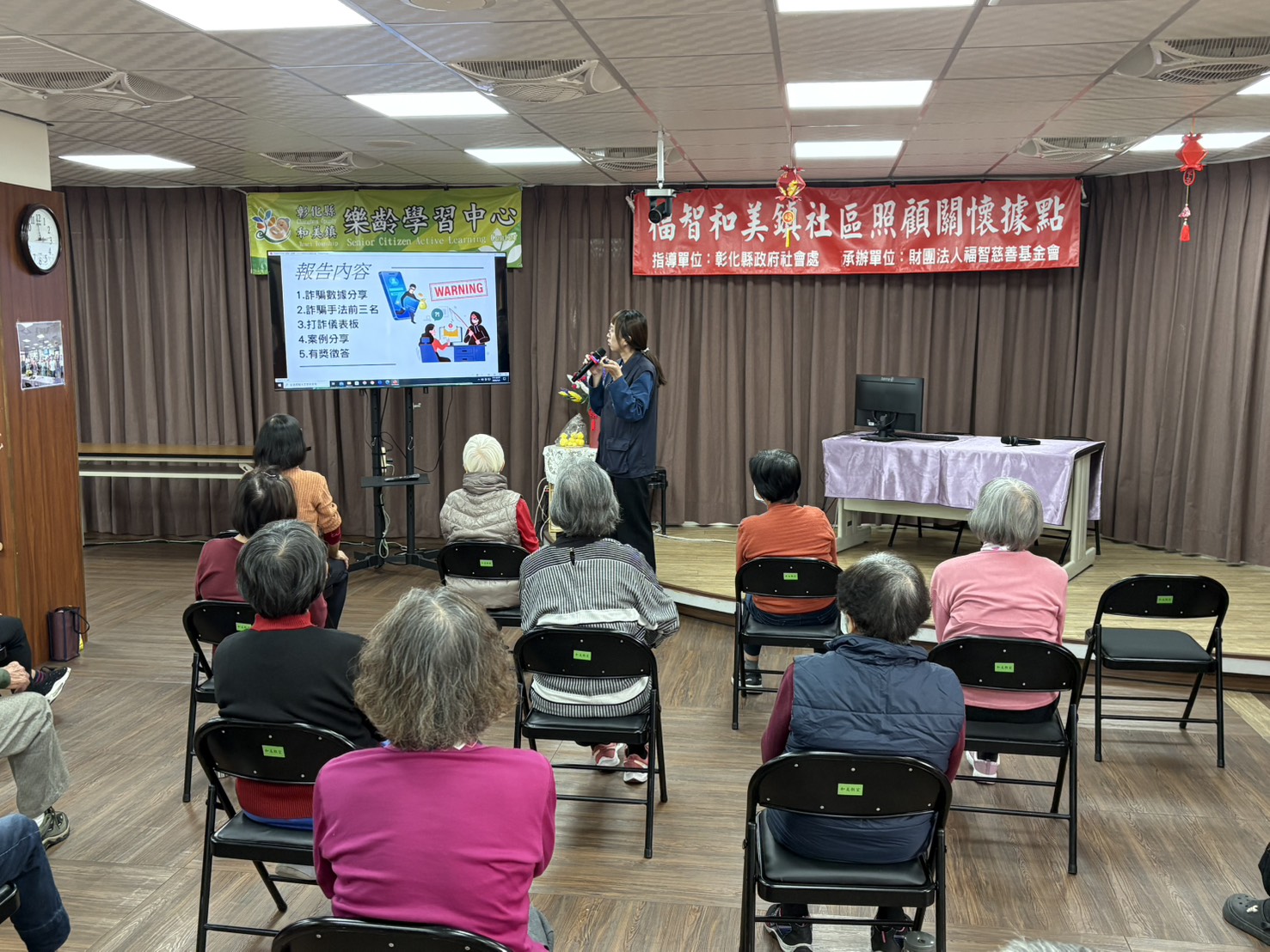 和美分局與福智慈善基金會攜手進行犯罪預防與交通宣導,犯罪預防方面透過案例宣導及問答方式,詢問長者有無類似遭詐騙經驗,藉由教導詐騙集團常見的詐騙手段,如假投資、假交友、猜猜我是誰等釣魚手法。交通安全方面向長者們宣導本分局常見行人違規態樣,提醒高齡者過馬路時務必遵守交通規則,不要任意穿越道路、過馬路應走斑馬線(並應舉手讓駕駛看得到),保護自己也保護其他用路人。並要注意大型車輛周圍潛在風險(如視野死角、內輪差)等重要交通安全觀念。 警方同時對長者透過交通事故影片及年齡層進行肇因分析,整理出常見違規態樣給社區居民觀看,並了解違規可能會造成嚴重的交通事故,教導正確的左轉方式,保護自己也保護他人;並加強里民識詐觀念,透過整理常見投資詐騙手段,深耕社區居民重要觀念,若接到可疑電話或簡訊,應撥打165反詐騙專線或至附近派出所查證。 藉由和美分局深入地方社區的機會,將犯罪防治、交通教育的觀念向下紮根,透過教育讓社區居民懂得保護自己的生命財產安全,並對此有更深一層的認知,以達寓教於樂的目的
