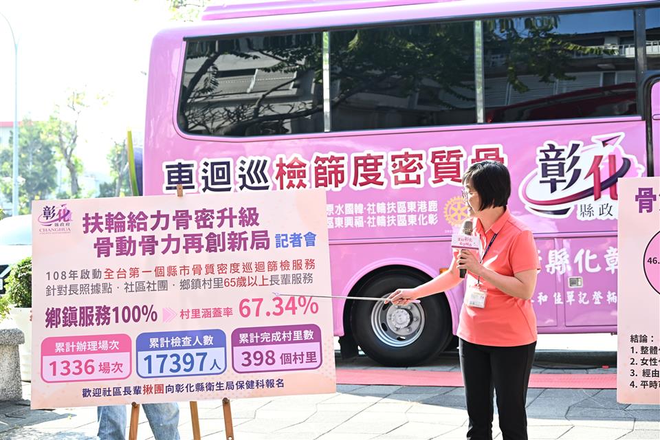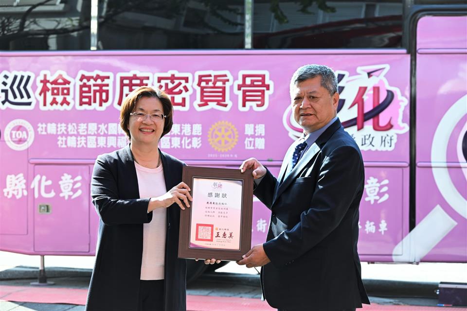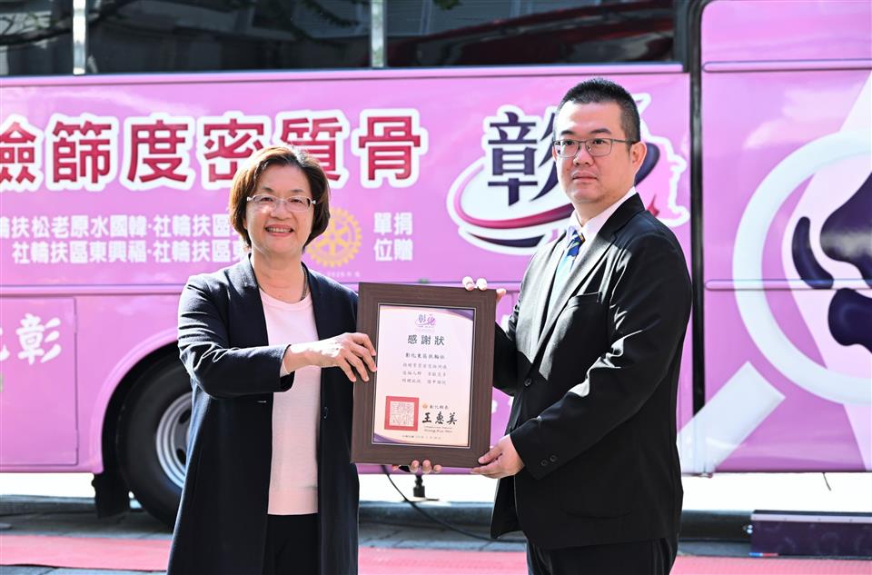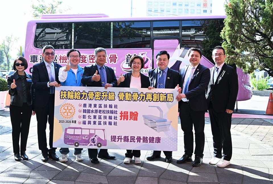 彰化縣政府於今(28)日在衛生局舉辦「扶輪給力骨密升級,骨動骨力再創新局」扶輪社捐贈骨質密度檢測儀記者會,由縣長王惠美代表接受捐贈。此次活動展現本縣自108年推動骨質密度社區巡迴篩檢以來的豐碩成果,感謝國際扶輪社3462地區、鹿港東區扶輪社長謝一清、彰化東區扶輪社長劉燦霖、福興東區扶輪社長陳鼎中以及韓國水原老松扶輪社,與以上全體社員,共同捐贈全球獎助金7萬美元(超過新台幣210萬元),全力支持本縣推動骨質密度社區巡迴篩檢服務,攜手守護縣民骨骼健康。 王縣長表示,感謝鹿港東區扶輪社、彰化東區扶輪社、福興東區扶輪社及韓國水原老松扶輪社長期與縣府合作,從過去的C肝根除、眼科外展服務巡迴車及儀器設備捐贈,到本次的骨質密度檢測車捐贈,協助偏鄉民眾,藉由骨質密度巡迴篩檢進行檢測,鹿港東區扶輪社跟福興東區扶輪社也持續挹注本縣經費超過50萬美元(超過新台幣1,500萬元)。這台骨質密度檢測車能深入偏鄉村里服務長者,讓長者得知骨密現況,進一步透過飲食、運動、曬太陽,讓骨本更穩固、獲得更好的照護。 王縣長指出,縣府自108年就開始推動全台第一個縣市骨質密度巡迴篩檢服務,至今邁入第7年,服務深入各鄉鎮市,深獲社區長輩肯定。累計辦理1,336場次、服務人數達1萬7千人、村里涵蓋率達67.34%。分析結果顯示,65歲以上族群骨質疏鬆盛行率高達46.28%,女性明顯高於男性,顯示高齡族群骨骼健康風險不容忽視,凸顯及早篩檢與介入治療的重要性。 國際扶輪社3462地區前總監楊曜聰表示,感謝王縣長縣府團隊的用心,守護縣民從產檢、幼兒照顧到長輩各項福利。長輩骨質疏鬆問題嚴重,一旦跌倒可能引發內出血等致命風險,未來可以透過檢測車,結合社區「不老健身房」進行數據比對,協助長輩預防骨質流失的各項風險。 鹿港東區扶輪社長謝一清表示,鹿港東區扶輪社一步一腳印,針對地方需求投入資源,陸續捐贈二林地區輔具,隨後擴大至C肝根除及護眼計畫等醫療支援,今年正逢第 20 屆,特別捐贈老人骨質疏鬆檢測設備。在社友的共同努力與各界支持下,鹿港東區扶輪社在健康公益上的累計捐贈金額已將近 50 萬美金。感謝王縣長縣府團隊對於民間公益的全力支持、3462 地區國際扶輪基金會的贊助,今天的捐贈代表對長者健康最深切的承諾。 福興東區扶輪社社長陳鼎中表示,連續3年參加扶輪社與縣府的合作案,社友們對於公益活動越來越有參與感,明年將結合各地力量照顧社區長者。福興東區扶輪社對於社區關懷除老人共餐活動外,會有更多元化的結合,期盼社友一起參與公益活動。 彰化縣醫師公會理事長蔡梓鑫表示,感謝扶輪社捐贈骨質密度篩檢巡迴車,對於彰化縣民的健康將有極大助益。也感謝王縣長對彰化縣醫師公會的協助,公會召開大會每次都親臨鼓勵。 衛生局表示,本縣推動之骨質密度社區巡迴篩檢服務,檢測部位涵蓋脊椎、腰椎及髖關節等部位,針對檢查結果顯示具有骨質疏鬆風險之長者,主動協助轉介至醫療院所進行進一步檢查與治療,以降低骨折發生風險,減輕家庭與社會照護負擔。未來衛生局也將持續結合在地醫療院所、社區據點及民間團體力量,擴大巡迴篩檢服務量能,並加強骨骼健康衛教宣導,推動運動、營養與預防保健等整合性策略,全面提升縣民骨骼健康識能,打造更完善的高齡友善健康照護網絡。 與會人員有縣議員許雅琳、莊陞漢、國際扶輪社前總監楊曜聰、地區秘書長江麗利、地區服務計畫主委黃台源、鹿港東區扶輪社創社長蔡國正、社長謝一清、福興東區扶輪社創社長侯志淵、社長陳鼎中、彰化縣醫師公會理事長蔡梓鑫、各區扶輪社社友、各級民代與地方仕紳等。