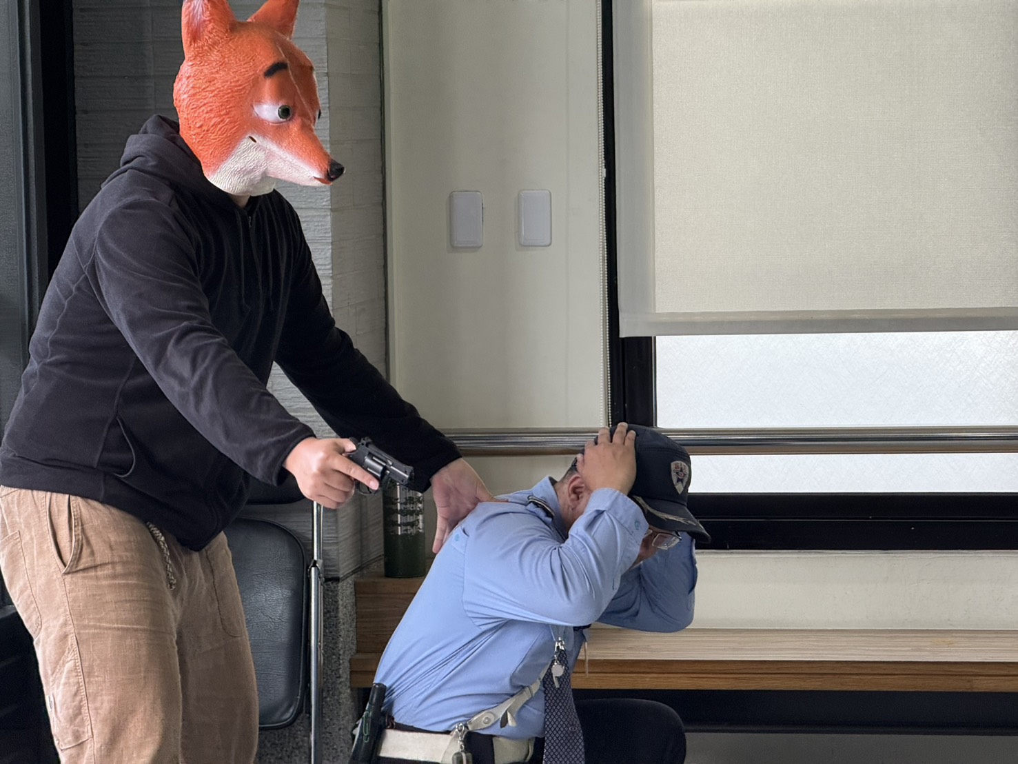 新年將近,為迎接年節到來並強化金融機構防搶應變能力,警方特別結合創意元素,辦理一場別開生面的防搶演練。演練中,由兩名頭戴「動物方程式」人氣角色狐尼克與快俠(樹懶)頭套的歹徒,佯裝成街頭互動表演人員進入銀行,藉由可愛形象降低行員與民眾戒心,伺機持槍喝令行員交出現金,現場氣氛瞬間緊張。 行員依標準作業流程冷靜應對,暗中按下警鈴通報警方,員警獲報後迅速趕抵現場。過程中,扮演快俠的歹徒因動作遲緩,尚未逃離現場即遭警方當場制伏逮捕;另一名頭戴狐尼克頭套的歹徒則駕車逃逸,警方立即啟動攔截圍捕機制,在勤務指揮中心即時通報下,線上警力於周邊路段形成包圍網,最終成功將其攔停逮捕,演練圓滿完成。 農曆年節期間,尾牙活動、年終獎金及紅包發放,金融機構現金流量大幅增加,容易成為不法之徒覬覦目標。警方除持續加強金融機構周邊巡邏、守望及臨檢勤務外,也透過防搶演練,提升員警快速應變能力與行員自我保護及通報機制,確保年節治安平穩。 田中分局分局長林鼎超表示,本次防搶演練以活潑有趣的角色作為開場,目的在提醒民眾,犯罪手法日新月異,歹徒可能利用任何方式降低被害人戒心,民眾切勿因外表可愛或熟悉形象而掉以輕心。警方也呼籲,年節期間如有大量現金存提款需求,可主動向警察機關申請護鈔服務,只要落實「財不露白」原則並提高警覺,就能有效降低遭搶風險,安心歡度佳節。