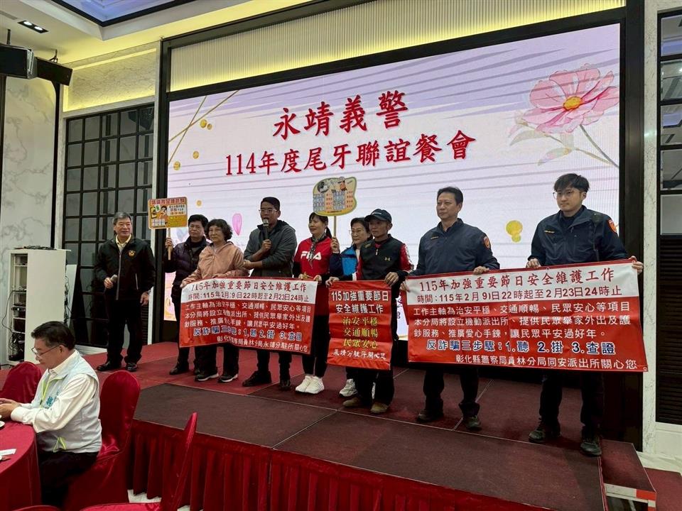永靖義警隊於近日舉辦「尾牙聯誼餐會」,活動現場氣氛熱絡溫馨,義警弟兄姊妹齊聚一堂,共同回顧一年來協助警政工作的點滴,並提前歡慶佳節。彰化縣警察局員林分局同安派出所亦把握難得機會,於餐會中進行重要節日安全維護及反詐騙、交通安全宣導,將治安與交通觀念融入社區活動中,展現警民合作、共維治安的良好情誼。 為維護重要節日期間社會治安與交通秩序,彰化縣警察局員林分局同安派出所將於115年2月9日22時起至2月23日24時止,全面執行「加強重要節日安全維護工作」,以「治安平穩、交通順暢、民眾安心」為三大目標,讓民眾安心過節。 於重要節日期間,將加強轄內巡邏、守望與交通疏導勤務,針對人潮聚集處、重要路口及易肇事路段,提高見警率,防制竊盜、詐騙及各類不法情事發生,並確保交通安全順暢,降低事故風險。 此外,警方也同步加強反詐騙及交通安全宣導,提醒民眾牢記「反詐騙三步驟:1聽、2掛、3查證」,遇到可疑來電或訊息,務必保持冷靜、多方求證;同時呼籲民眾「酒後不開車、開車不喝酒」,共同維護自身與他人用路安全。 員林分局表示,重要節日期間將秉持「為民服務」精神,主動關懷民眾需求,提供必要協助,期盼透過警民合作,共同營造一個安全、平安、安心的節日環境。
