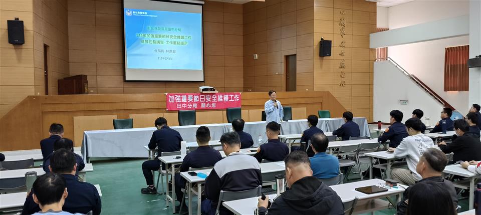 農曆春節將至,115年加強重要節日安全維護工作也將從2月9日22時開始,為了讓鄉親安心好過年,彰化縣警察局田中分局於2月6日在禮堂舉辦加強重要節日安全維護工作任務講習,由分局長林鼎超親自主持,召集全體外勤幹部與第一線執勤同仁參加,透過宣達勤務重點與分享實務經驗,提升員警的執勤警覺性與突發狀況應變能力,展現警方在春節期間守護地方、打擊犯罪的決心。 田中分局分局長林鼎超表示,本分局將持續致力於「治安平穩、交通順暢、民眾安心」三大工作主軸,統籌運用協勤民力,加強本轄高鐵彰化站、田中車站等大眾運輸場站交通疏導與管制,並於春節初一、初二於社頭鄉清水岩寺設置機動派出所服務民眾;另因應春節期間民眾現金需求增加,田中警亦提供民眾大額現金護鈔服務,以確保民眾財產安全,歡迎鄉親向就近轄區分駐(派出)所申請。
