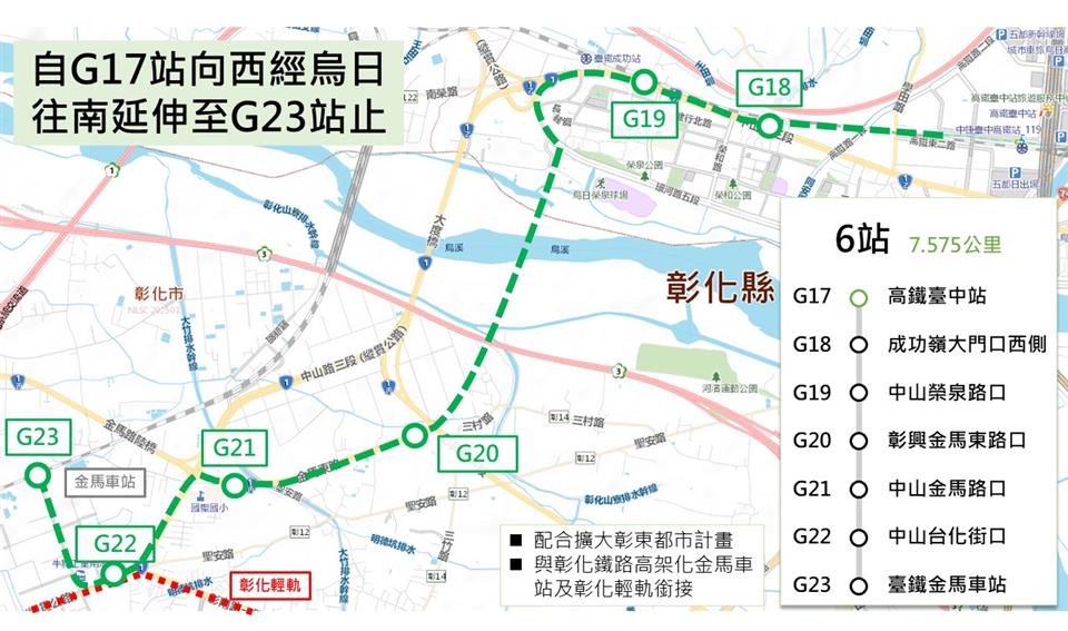 台中捷運綠線延伸大坑及彰化計畫再傳新進展。台中市政府今(11)日與彰化縣政府召開「捷運共同推動小組會議」,由台中市副市長黃國榮與彰化縣副縣長周傑共同主持,會中原則審議通過捷運綠線延伸大坑及彰化之綜合規劃報告。後續將依審議意見進行微調,預計於今年3月提報交通部審議,持續爭取行政院核定。 黃國榮副市長表示,台中捷運綠線通車以來,運量穩定成長,已成為市民通勤與日常移動的重要公共運具。未來向北延伸大坑,可強化大坑風景區與市區間的觀光與通勤連結,並有助分擔松竹路沿線及假日遊憩車流,改善交通壅塞情形;向南延伸彰化,則可串聯烏日與彰化生活圈,提升跨縣市通勤效率,形塑橫跨台中、烏日及彰化的捷運運輸廊帶,促進區域均衡發展。 彰化縣副縣長周傑指出,台中與彰化兩地居民往來密切,捷運綠線延伸案對彰化整體發展具有關鍵意義。彰化縣政府將全力配合台中市政府推動時程,積極克服用地取得等相關問題,促使延伸彰化段如期推動,並與縣府規劃中的輕軌鹿港線及和美線銜接,打造更完善的中彰公共運輸路網,帶動區域發展,嘉惠兩地民眾。 台中市捷工局長蘇瑞文說明,綠線延伸線全線採高架型式,全長約10.041公里,規劃設置8座車站。其中北向「大坑延伸段」自舊社站(G03)出發,跨越旱溪後延伸至大坑地區,長約2.466公里,增設2站;南向「彰化延伸段」則自高鐵台中站(G17)起,沿烏日高鐵特定區延伸至彰化市區,並銜接彰化鐵路高架化後新設的金馬站,全長約7.575公里,增設6站。完工後可整合捷運、高鐵及台鐵系統,強化中部公共運輸網絡。 彰化縣政府交通處長林孟弘補充,綠線延伸案於彰化市內之場站位置均已確定,並規劃於G22站銜接彰化輕軌鹿港線,G23站可轉乘台鐵及輕軌和美線,縣府將同步完善站區動線與轉乘設計,提升民眾未來轉乘的便利性與舒適度。 台中市捷運工程局表示,綜合規劃報告提報中央後,市府將全力爭取交通部及行政院支持。後續於完成核定、細部設計、用地取得及施工等階段後,整體建設期程預估約9年。未來大坑延伸段可提升遊憩交通品質,彰化延伸段則能強化跨區通勤效能,市府將持續與彰化縣政府攜手合作,打造便捷、永續的中部捷運路網。