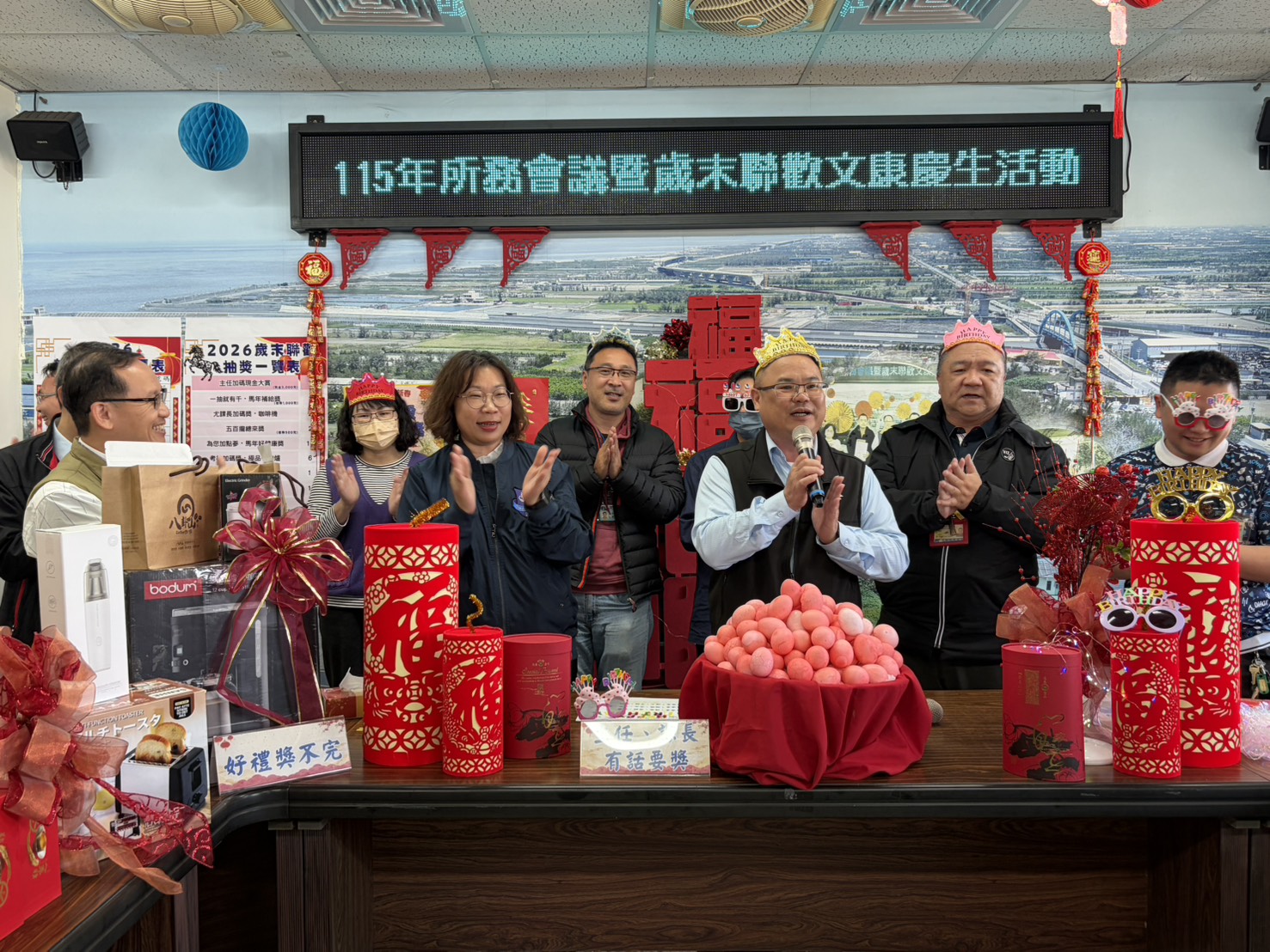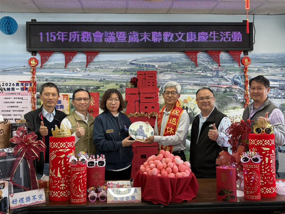 農曆春節將至,二林地政事務所於2月12日下午召開所務會議,並舉辦歲末聯歡文康暨慶生活動。活動由該所主任及各課課長們精心準備多項獎品,提供現場同仁摸彩同樂,氣氛溫馨熱鬧、笑聲不斷。現場亦貼心備有餐點與象徵喜氣與祝福的紅蛋,讓同仁在共享美食的同時,感受濃濃年節氛圍,增進彼此情誼,充分展現二林地政團隊的向心力與凝聚力。 劉志宏主任於會中感謝全體同仁一年來的辛勞與付出,使各項業務得以穩健推動,並於會中歡送燕輝大哥榮退,場面溫馨感人。本府地政處陳麗梅處長、何明修副處長及黃錫欽科長亦在百忙中蒞臨,致贈退休 紀念品並獻上祝福,感謝其多年來在地政工作的用心與貢獻;同時也熱情歡迎新進同仁黃子瑄、薛羽容及陳彥璁加入二林地政團隊,期許在新血加入下,為團隊注入更多活力與動能。 劉主任表示,透過所務會議,讓平日業務繁忙的同仁齊聚一堂,促進交流互動,增進各課同仁間的情誼;並期許新的一年,大家能馬力全開、步步穩健,將過去的辛勞轉化為前進的動力,累積成果、邁向更美好的未來,最後祝福大家新春愉快,躍馬向前、好運相隨! 業務單位:彰化縣二林地政事務所 聯絡人:柯小姐 電話:04-8964793#208