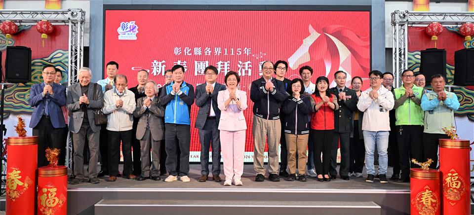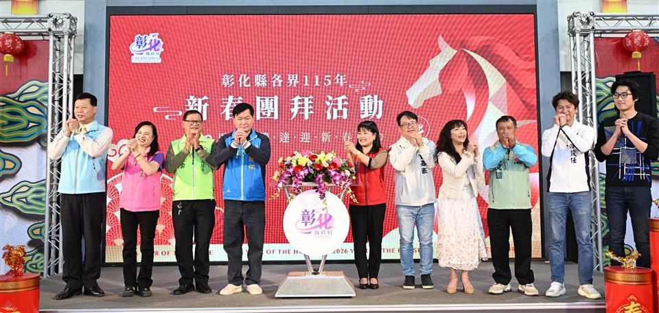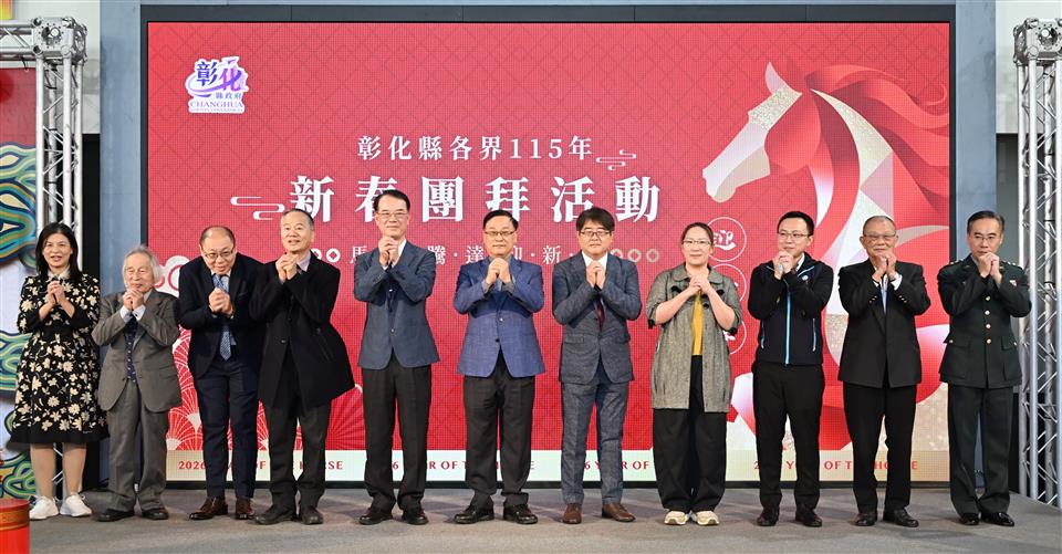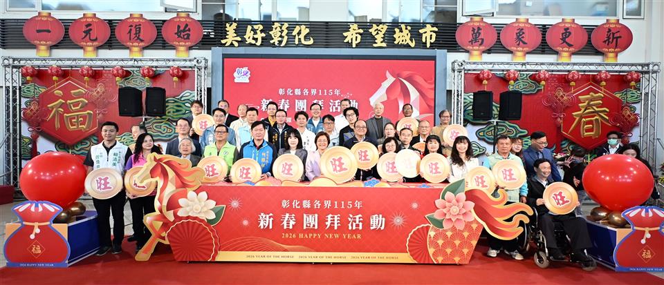 馬躍騰達,福滿彰化!彰化縣政府於今(23)日在縣府中庭舉辦彰化縣各界115年新春團拜活動,由彰化縣長王惠美主持,邀集民意代表、士農工商、文化及各界代表齊聚一堂,共賀新春、暢談未來,現場氣氛熱絡。王縣長親自向與會貴賓及縣府同仁致上新春祝福,感謝大家多年來攜手打拚,並祝福新的一年政通人和、風調雨順、五穀豐登、百業興旺、人和家順,士農工商都有好發展,各行各業一路發發發,一馬當先、馬到成功、馬上健康、馬上幸福,平安順利! 王縣長表示,帶著感恩的心來參加,這是任內最後一次主持新春團拜,感謝鄉親一路上的支持,協助縣府持續並堅定地向前邁進。縣府始終秉持「做對的事、做應該做的事、做對彰化有利的事」的理念,在交通建設、產業升級、教育扎根、社會福利以及環境永續等面向,持續改造彰化。在改善交通系統、公共設施更新、農產品牌化、青年返鄉就業,以及長期照顧與育兒政策都有長足的發展,感謝議長謝典霖與所有議員對預算的支持,同時感謝鄉親信任,以及所有同仁的付出。 王縣長指出,雖然未來仍有許多挑戰,但縣府團隊始終站在第一線,守護中小企業不受國際政經情勢衝擊,讓彰化產業更具韌性;持續推動公共建設,打造均衡發展的城市;完善社會福利體系,讓長輩、孩童以及弱勢族群都能獲得更完善的照顧。引領彰化成為更宜居、更具競爭力的城市,「美好彰化、希望城市」的願景,需要一棒接一棒傳承下去,期待大家發揮龍馬精神,繼續為彰化打拚。 王縣長進一步指出,臺中捷運綠線延伸案,以及彰化捷運路網、水五金產業聚落特定區計畫與交流道特定區計畫,都已經進入關鍵階段。期待彰化未來的接班人,在既有基礎上持續努力,帶領縣府團隊再創高峰。 立委謝衣鳯表示,祝福大家新的一年萬馬奔騰,做什麼都順利、做什麼都成功,馬上好運、馬上有福。 士農工商軍警消醫界所有代表一起祝福各位身體健康、馬上快樂、馬年收穫滿滿、萬事興旺。 彰化縣政府表示,新的一年,將以馬年的精神,持續秉持穩健、務實與創新的態度,攜手縣民向前邁進,引領彰化成為更幸福、更宜居、更具競爭力的「美好彰化 希望城市」。 與會貴賓有立委謝衣鳯、縣議員黃柏瑜、柯振杯、蕭文雄、凃俊任、劉惠娟、曹嘉豪、陳玉姬、李俊諭、賴清美、彰化市長林世賢、員林市代理市長賴致富、埤頭鄉公所主秘許鳳玲、彰化縣商業會副理事長黃智暉、秘書長梁中原、彰化縣工業會副理事長賴勝煌、秘書長陳永興、彰化律師公會理事長黃勃叡、彰化縣職業總工會理事長許英義、彰化縣職業工會總工會理事長陳朝雄、彰化縣產業總工會理事長施能貴、彰化縣職業勞工總工會理事長黃椿樣、彰化區漁會總幹事陳威谷、彰化縣農會總幹事呂佩臻、彰化縣後備指揮部指揮官梅上校、彰化縣醫師公會理事長蔡梓鑫、社團法人彰化縣新住民發展協會理事長李明輝、彰化縣書法學會理事長吳肇勳、人間國寶施鎮洋、工策會總幹事洪榮章、彰化縣副縣長周傑、縣府秘書長蔡明娟、社會處長王蘭心等縣府一級主管、參議柯呈枋、各戶政事務所與地政事務所主任、工藝家、藝術家、企業代表、各社會團體代表、各民意代表與地方仕紳等。