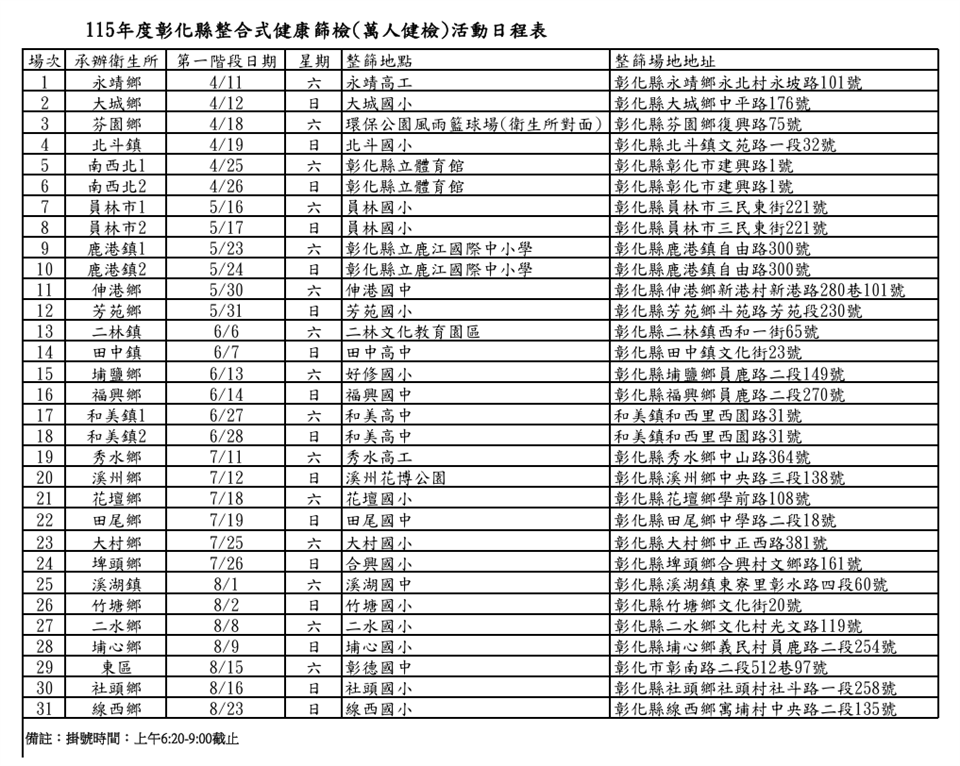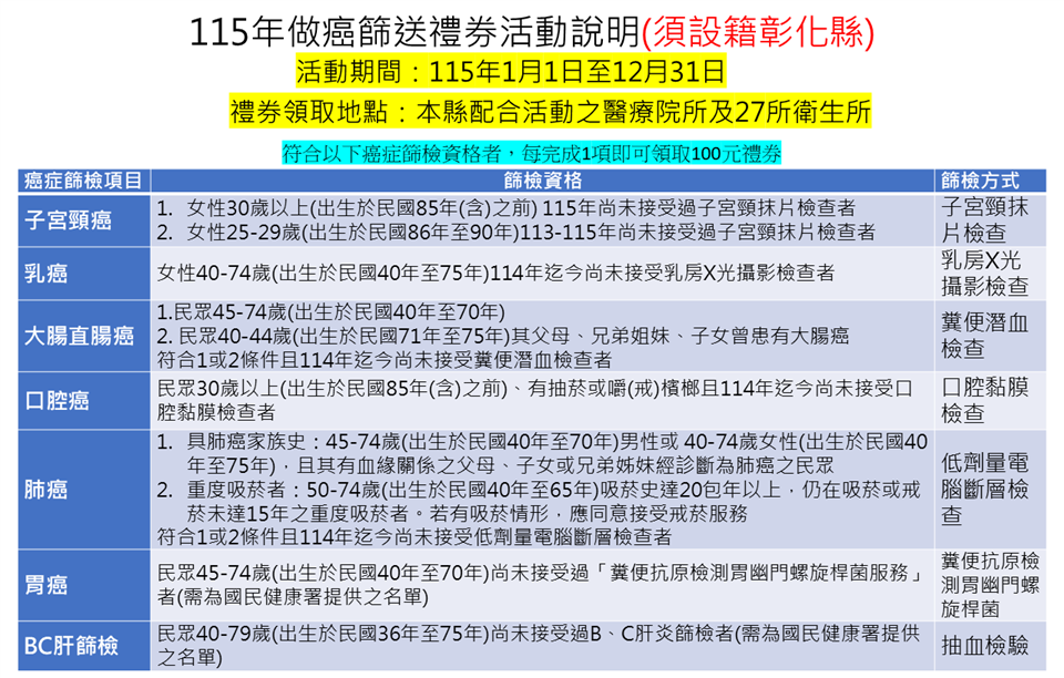 彰化縣長王惠美縣府團隊持續照顧縣民健康,彰化縣一年一度的整合式健康篩檢活動(萬人健檢)將於4月11日(星期六)在永靖鄉永靖高工正式展開,今年賡續規劃於全縣26鄉鎮市辦理31場次,讓鄉親在家鄉就能一次完成多項重要檢查,落實「早篩檢、早發現、早治療」,守護自己與家人的健康。 本活動分兩階段辦理,第一階段為健康檢查活動,除成人健康檢查項目外,另加驗高密度脂蛋白、B型肝炎表面抗原、C型肝炎抗體、甲型胎兒蛋白、子宮頸抹片檢查、口腔黏膜篩檢、大腸直腸癌篩檢、胃幽門桿菌篩檢及胸部X光檢查等多項檢查(癌症篩檢須符合資格條件)。第二階段於活動結束2週後,邀請專科醫師現場解說報告,提供衛教指導、轉介諮詢、乳癌篩檢及體適能檢測,讓篩檢更完整、健康更有保障。 衛生局呼籲只要設籍彰化縣,年滿40歲以上符合成人健康檢查資格,且同時符合任一項癌症篩檢資格者,即可報名參加;另女性年滿30歲以上且子宮頸抹片3年以上未檢查或從未檢查者,也歡迎踴躍向各衛生所報名。 今年縣府持續推出篩檢送禮券活動,凡完成一項癌症篩檢即可獲得100元禮券一張,做越多、領越多,鼓勵鄉親主動篩檢、全面守護健康,活動延長至12月31日,請大家把握機會。健康不能等,預防勝於治療。一次健檢,就是給自己與家人最實在的保障。縣府將持續推動各項健康政策,陪伴鄉親邁向健康、幸福的彰化。 活動詳情請洽衛生局聯絡人及電話:衛生局保健科姚玉津科長、承辦人張凱雯(04)7115141轉5505,115年日程表請至衛生局網站/衛生資源/保健類下載(網址:https://www.chshb.gov.tw/taxonomy/term/67#gsc.tab=0)。