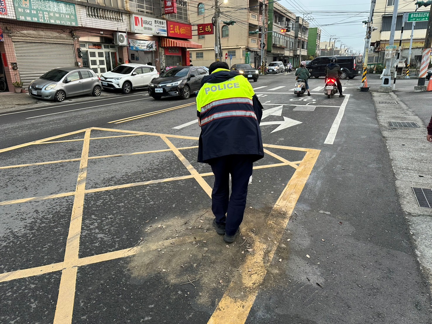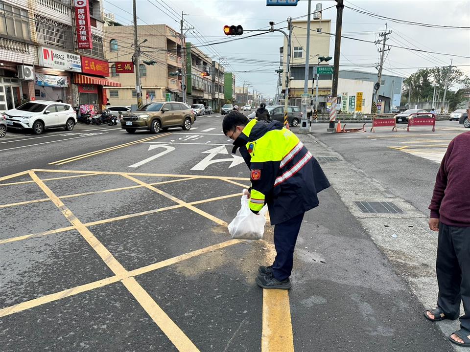 因民眾未注意車前狀況而發生交通事故,導致機車機油溢漏一地造成路過之人車有安全顧慮,員警於處理車禍結束後,主動及時處理恢復道路通行備受民眾讚許。 鹿港分局頂番派出所警員胡博舜、莊舜喆、洪子軒,日前執行轄區巡邏勤務時,於17時30分許接獲通報在鹿港鎮鹿和路4段附近有發生交通事故,員警獲報後立即趕往現場處理,經處理完畢道路恢復通行後,見車道上溢漏一地的油漬,由於當時正值下班尖峰期為避免行經之車輛閃避不及打滑而造成二次交通事故,隨即向事發附近民宅住戶商借打掃器具及泥土,使交通恢復順暢及讓道路不致油滑,安全無虞後,始離開現場恢復勤務,路過民眾及附近居民見員警此舉,對員警主動、積極態度深表肯定與讚許。 本案警員胡博舜、莊舜喆、洪子軒處理事故態度積極、敏覺性高、能及時給予處理,發揮同理心精神,能感同身受民眾可能發生之危害,民眾對警方作為表達高度肯定與感謝,充分提升警察的正面形象。