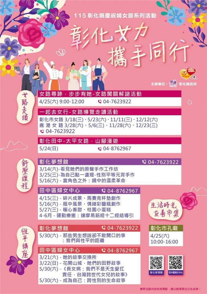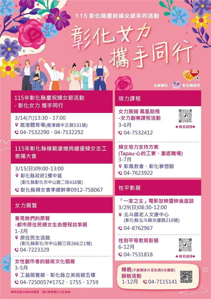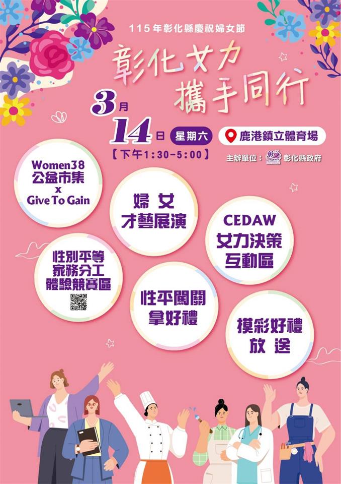 為響應國際婦女節到來,彰化縣政府14日在鹿港鎮立體育場舉辦「115年彰化縣慶祝婦女節活動-彰化女力 攜手同行」,縣長王惠美到場支持並與鄉親一同為活動揭開序幕。王縣長表示,為響應2026年國際婦女節主軸的「Give to Gain(付出即有收穫)」,活動現場除了設有「CEDAW女力決策互動區」及打卡牆外,還有「Women38公益市集」愛心義賣,義賣活動,自109年起至今,連續五年每年捐助百萬元,支持縣內社福機構籌建家園及興建設施,義賣善款累計已達新臺幣500萬餘元,今年義賣所得將捐助給「社團法人彰化縣小嶺頂愛啟兒關懷協會」作為建造「愛啟兒社區日間作業設施」之用,感謝鄉親把家中物品透過義賣,傳達互助互惠的精神,以實際行動支持公益,將愛轉化成改變的力量,造福更多弱勢朋友。 王縣長表示,女力是股溫暖且團結的力量,在家庭、職場及社會各個角落努力耕耘,是家庭與社會穩定的重要基石,這次活動公私協力,結合縣府各局處、相關婦女團體及社福團體等,感謝各婦女及社福團體長期對提升婦女福利與權益的支持與投入,讓彰化在推動婦女權益及性別平等的道路上持續向前行。 王縣長指出,依據每五年辦理一次的「113年彰化縣婦女生活狀況需求調查」顯示,本縣女性承擔家務的比例高於全國平均,且每日從事家務時間較男性長,顯示家務分工仍有努力的空間。今日活動特別設計4關以「家務分工」為主題的性別平等家務分工體驗競賽區,傳達家務承擔的理念,從家庭日常開始實踐性別平等。縣府也跨領域規劃辦理115年彰化縣模範婆媳與績優婦女志工表揚大會、「女力展翅 鳳凰助飛」女力創業課程活動、彰化女路走讀、女力展覽、性別平等教育影展、性別平等講座、婦癌篩檢、各類紓壓培力等系列活動,邀請各界踴躍報名參加,課程活動,以尊重、互愛與包容,打造性別友善的城市。 與會貴賓還有縣議員陳玉姬、施佩妤、凃淑媚、立法委員陳素月服務團隊、縣府社會處長王蘭心、副處長涂敏群、彰化縣婦女會理事長陳穎青、輔導理事長楊秀霞、田中鎮青溪婦女會理事長邱雅涵、溪湖婦聯會主委黃瑞珠、埔鹽青溪婦女協會理事長張美霞、彰化縣埔鹽婦女會理事長陳貴玲、彰化縣姐妹會理事長林碧鬆、彰化縣女性培力協會理事長陳翠蓮、彰化縣婦女發展協會理事長黃椿樣、彰化縣東南亞文化協會理事長邱莉亞、彰化縣二水鄉婦女會理事長陳昭麟、彰化縣婦女企業諮詢委員會副會長巫美玲、越南橋裔高階人才在台總會理事長范氏伶、各級民代、地方仕紳等。