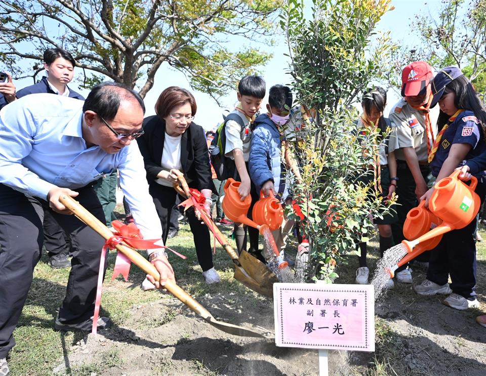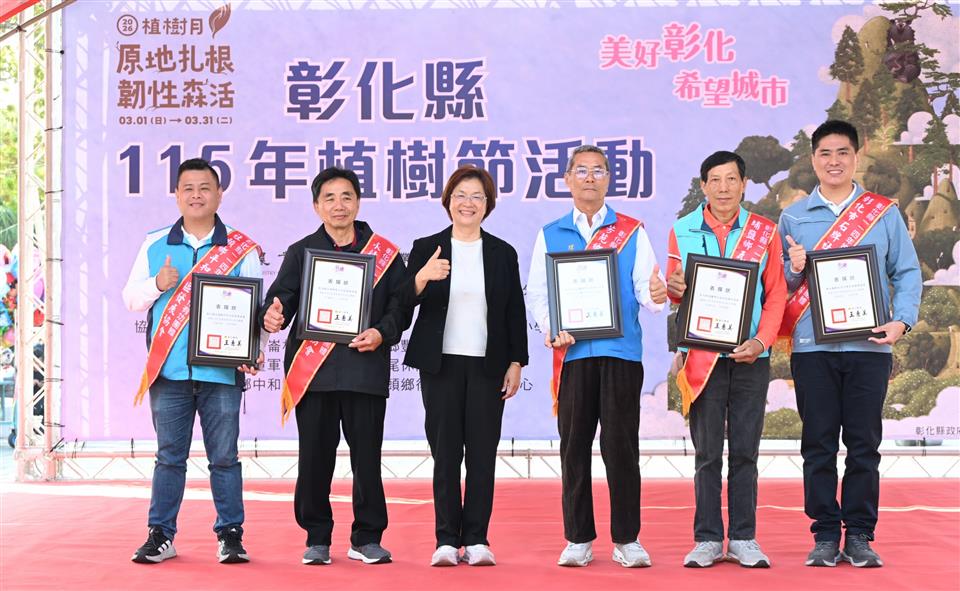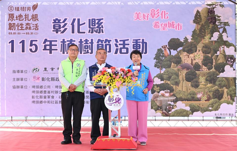 為推廣環境綠美化,彰化縣政府、農業部林業及自然保育署南投分署、埤頭鄉公所、埤頭鄉民代表會及埤頭鄉農會,於今(15)日在埤頭鄉豐崙公園共同辦理「彰化縣115年植樹活動-原地扎根•韌性森活」活動,現場有來自社區、學校、企業等各界夥伴,親手將樹苗扎根鄉土,展現面對環境變遷的自信與韌性。 王縣長表示,植樹不僅是種樹,更是為土地播下希望的種子。今天我們攜手種下厚葉石斑木、山芙蓉、椬梧、水黃皮、珊瑚樹、白水木、象牙木等7種本地原生樹種,代表對土地的承諾。近年來縣府已提供逾30萬株樹苗,給鄉鎮市公所、學校及機關團體,期盼為彰化種下蓊鬱如蔭的未來。 王縣長指出,活動現場設置政令宣導攤位及手作植栽DIY,並提供金毛杜鵑、蘭嶼羅漢松、厚葉石斑木、七里香等原生樹苗各500株,共2,000株,開放民眾現場領取。同時表揚114年度本縣綠美化有功人士及團體,感謝盡心盡力為社區綠美化而努力。希望透過植樹活動,引領民眾更關懷這片孕育我們的土地。 農業部林業及自然保育署副署長廖一光表示,春暖花開是適合種樹的季節。由於氣候變遷,碳排放量越來越多,種樹可以改變微氣候並固碳,這也是逐漸受到重視的「碳匯」。今天在埤頭種樹,將附近生態串連,作為生態保育的重要基礎。 立委謝衣鳯表示,期盼大家共同達成永續發展及減碳目標,並將碳匯作為工具引導大眾朝向節能減碳邁進。 埤頭鄉長杜懿彩表示,豐崙公園是埤頭腹地最大的公園,緊鄰社區活動中心。植樹節讓公園種植更多樹木,也能吸引更多民眾來這邊休憩。 農業處表示,本次植樹節活動象徵對土地的深耕與承諾,展現面對環境挑戰時的適應力與包容力,以期土地自我修復並持續茁壯。每年3、4月間,縣府與各鄉鎮市公所合作辦理植樹活動,由縣府提供苗木給各鄉鎮市公所辦理苗木贈送活動,促進民眾對植樹綠化的參與。縣府近3年共計配撥機關團體及學校苗木達30餘萬株,完成400餘個村里社區綠美化,各村里社區如有環境綠美化-苗木提供之申請需求,可至縣府農業處網站下載相關資料及申請書提出申請。 與會貴賓有立委謝衣鳯、農業部林業及自然保育署副署長廖一光、南投分署長李志珉、縣議員劉淑芳、李俊諭、吳錦潭、埤頭鄉鄉長杜懿彩、埤頭鄉農會理事長楊宏超、彰化縣童軍會總幹事陳榮茂、彰化縣工商發展投資策進會總幹事洪榮章、縣府農業處長郭至善、豐崙國小校長謝鴻達、田中國小校長陳泗正、大統幼兒園園長陳勉華、埤頭青農聯誼會長張義鑫、各校及社區代表、各級民代與地方仕紳等。