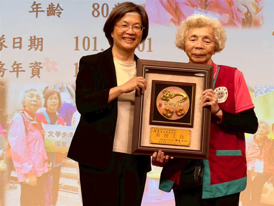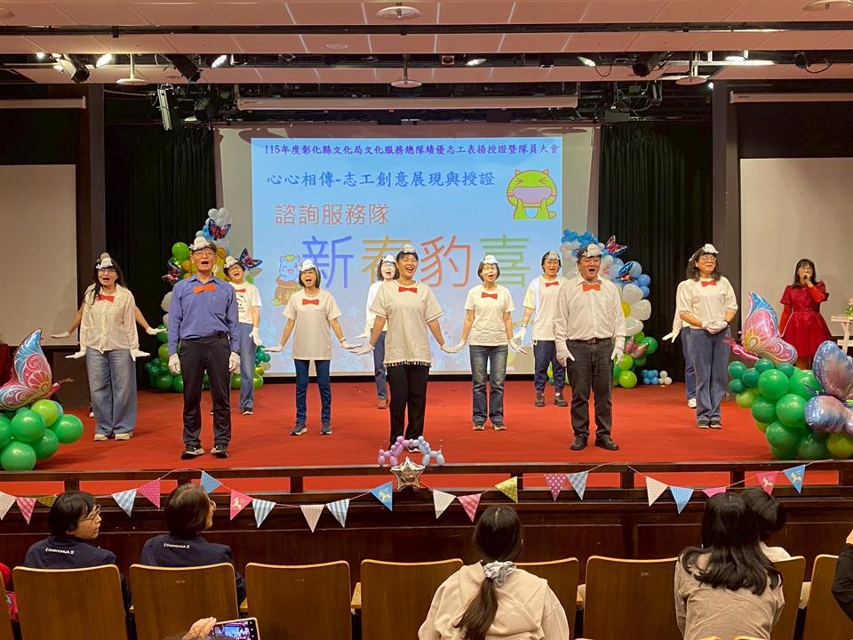 彰化縣文化局於3月15日下午在南北管音樂戲曲館表演廳辦理「115年彰化縣文化局績優志工表揚、授證暨隊員大會」,由縣長王惠美表揚榮獲文化部第32屆全國績優文化金質獎志工、榮退志工、文化局績優志工榮譽獎共36人;另頒發文化資產導覽志工授證16人及412位志工服務聘書。王縣長特別感謝志工朋友們長期熱心服務與貢獻,並鼓勵民眾付出熱情投入志工行列。 本次的志工表揚活動,特別表揚去(114)年榮獲全國績優文化志工金質獎陳年香,長期奉獻心力協助古蹟日活動與彰化縣史館服務工作等,服務年資達26年以上;另外高齡榮退志工陳賞女士(80歲),長期以來積極熱心服務民眾,並協助彰化縣立圖書館櫃檯流通及整架等工作,秉持服務熱忱不落人後的理念,服務精神可嘉。 表揚活動的一大亮點,為首度辦理「專業導覽志工授證」,文化局為持續提升服務品質並建立導覽制度,規劃完整培訓課程,結合實務導覽評核與資格審查,並建立導覽志工考證機制;於三年前即啟動「文資彰化定點解說服務」志工培訓計畫;規劃文化資產與導覽技巧等課程,並由資深志工及專業講師帶領學習,志工完成培訓後,須通過文史專家及評核機制審查,始授予導覽志工證書,目前共有16位志工通過認證,成為文化局首批專業導覽志工,象徵彰化文化導覽服務邁向制度化與專業化的重要里程碑;今年度亦將持續推動縣立美術館及南北管音樂戲曲館導覽志工培訓計畫,進一步提升場館導覽服務量能。 今年的志工授證活動,文化局頒予7個志工服務隊總計412位志工服務聘書,期勉志工為文化工作繼續服務,展現為民服務品質。本次授證儀式各隊志工以說唱表演的創意展現方式展現團隊特色與活力,讓授證活動充滿溫度與朝氣,鼓舞每位志工都抱著歡喜的心情,以更多的熱忱來為民服務。 表揚名單如下: 一、第32屆全國績優文化志工(1名):陳年香 二、榮退志工(1名) :陳賞 三、文化局績優志工榮譽獎(34名): 光輝榮譽獎(累積15年績優獎):陳寶卿、曾碧霞 特級榮譽獎(累積12年績優獎):陳碧玉、陳俊焜 一級榮譽獎(累積9年績優獎):施吉松、楊坤林 二級榮譽獎(累積6年績優獎):蔡芳季、林秋美、林瑞瑜、林暌芳梁靜月、邱顯超 三級榮譽獎(累積3年績優獎):張玉芹、黃玉梅、張春回、黃綺玲陳美雲、張芳榮、李日美、張文銣、倪慧娟、洪桂美、葉春生、楊麗琴、謝淑淨、林麗玉、劉淑麗、李娟娟、張姿惠、柯翠芸、林惠玉、宋少華、王惠美、林惠三