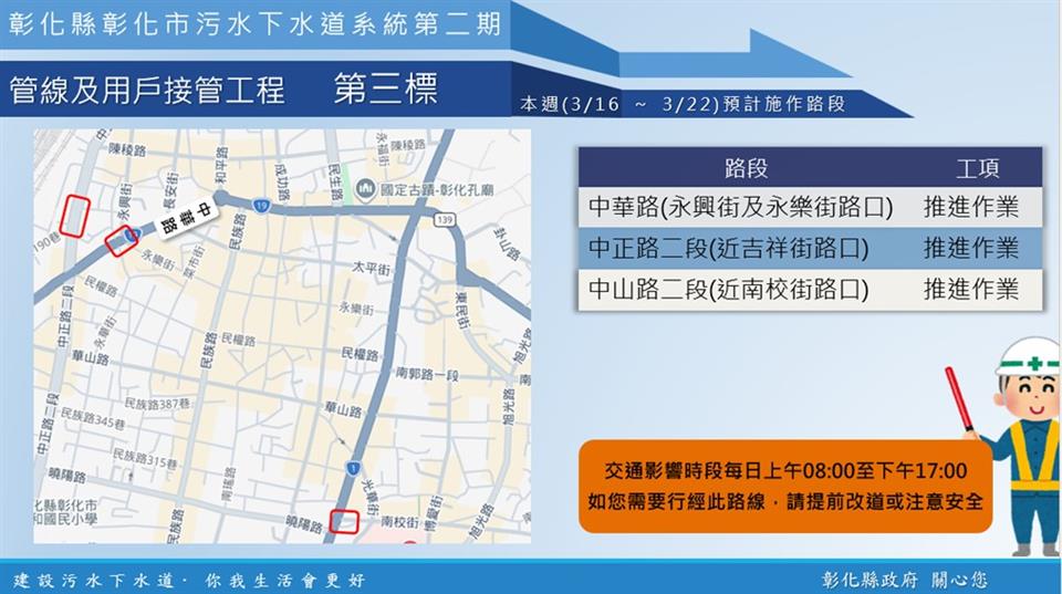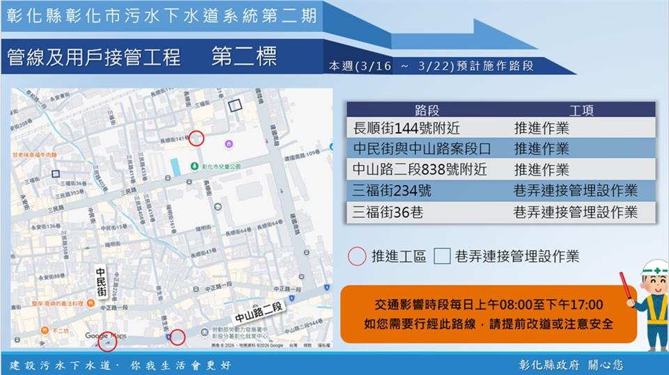 內政部國土管理署下水道工程分署於彰化市區正進行彰化市污水下水道系統管網工程,於中山路二段、三福街、長順街等重要市區道路進行施工,本週各區施工工項及路段如下,相關期程將視施工情形調整,部分路段實施車道分流及縮減,用路人可多加留意施工路段,注意用路安全,造成不便之處,敬請見諒! 1、 彰化市污水下水道系統第二期管線及用戶接管工程第二標,於長順街144號附近、中民街與中山路案段口、中山路二段838號附近,進行推進作業;於三福街234號、三福街36巷,進行巷弄連接管埋設作業。 2、 彰化市污水下水道系統第二期管線及用戶接管工程第三標,於中華路(永興街與永樂街路口)、中正路二段(近吉祥街路口) 、中山路二段(近南校街路口),進行推進作業。
