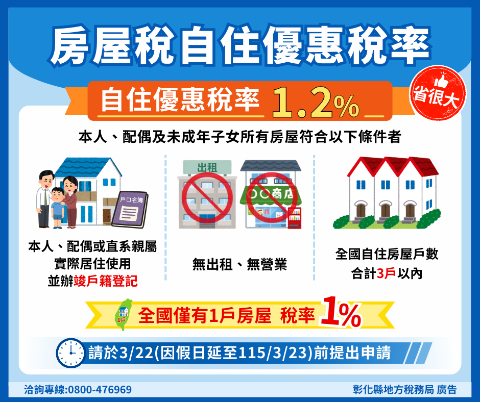 彰化縣地方稅務局表示,房屋稅新制規定自住房屋必須有本人、配偶或直系親屬任1人設有戶籍登記,且在開徵40日(即3月22日,今年遇假日順延至3月23日)以前遷入戶籍及提出申請,才能適用自住住家用優惠稅率。 個人所有房屋適用自住住家用稅率課徵房屋稅,須同時符合三個條件:一、房屋無出租或營業使用。二、本人、配偶或直系親屬實際居住使用並於該屋辦竣戶籍登記。三、本人、配偶及未成年子女全國合計3戶以內。但如未有本人、配偶或直系親屬設立戶籍,將按非自住住家用稅率2.6%至4.8%課徵,與自住住家用稅率1.2%相差至少1倍以上。 提醒民眾符合自住住家用稅率課徵房屋稅要件者,請儘速於今(115)年3月23日以前提出申請,115年期房屋稅才可適用自住用優惠稅率,另外,戶籍遷徙可能影響到農保、身心障礙牌照稅免稅等權益,請民眾特別留意。如有疑問請洽稅務局免費服務專線0800-476969洽詢。