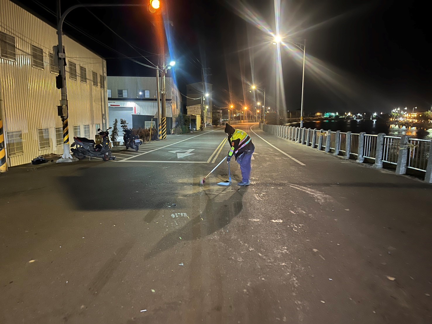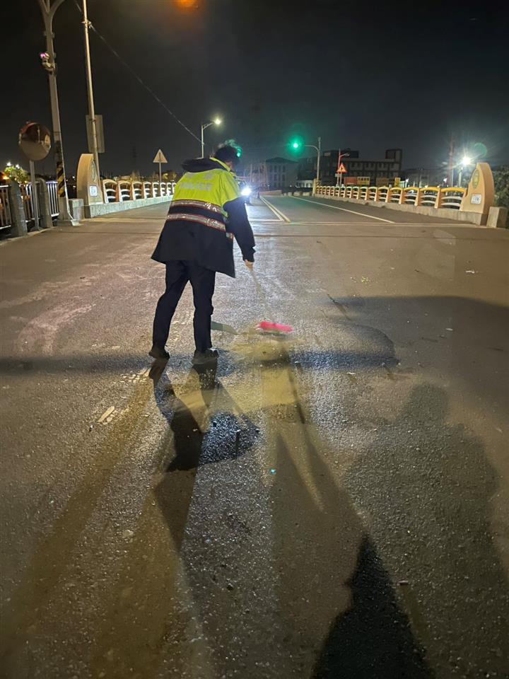 因民眾未注意車前狀況而發生交通事故,導致機車機油溢漏一地造成路過之人車有安全顧慮,員警於處理車禍結束後,主動及時處理恢復道路通行備受民眾讚許。 鹿港分局頂番派出所警員胡博舜、莊舜喆,日前執行轄區巡邏勤務時,於22時10分許接獲通報在鹿港鎮環河南路3段溝尾巷附近有發生交通事故,員警獲報後立即趕往現場處理,經處理完畢道路恢復通行後,見車道上溢漏一地的油漬,由於當時正值深夜為避免行經之車輛閃避不及打滑而造成二次交通事故,隨即向事發附近民宅住戶商借打掃器具並使用路旁泥土讓道路不致油滑,使交通恢復順暢及安全無虞後,才離開現場恢復勤務,路過民眾及附近居民見員警此舉,對員警主動、積極態度深表肯定與讚許。 本案警員胡博舜、莊舜喆處理事故態度積極、敏覺性高、能及時給予處理,發揮同理心精神,能感同身受民眾可能發生之危害,民眾對警方作為表達高度肯定與感謝,充分提升警察的正面形象。