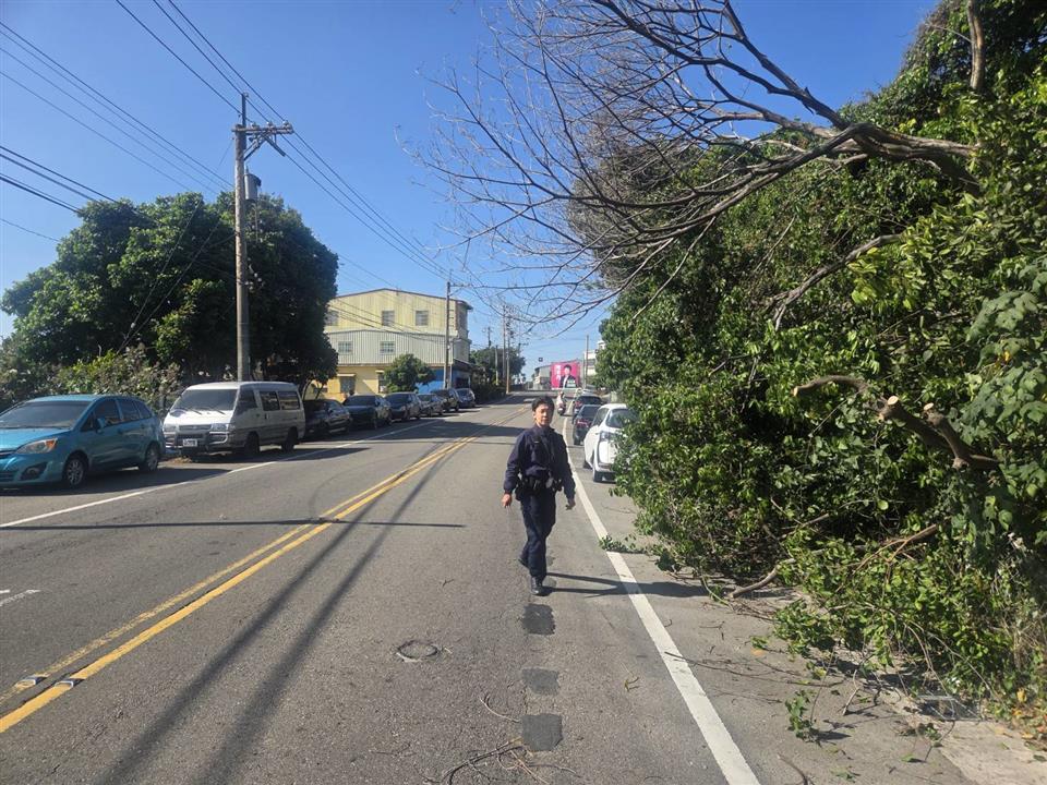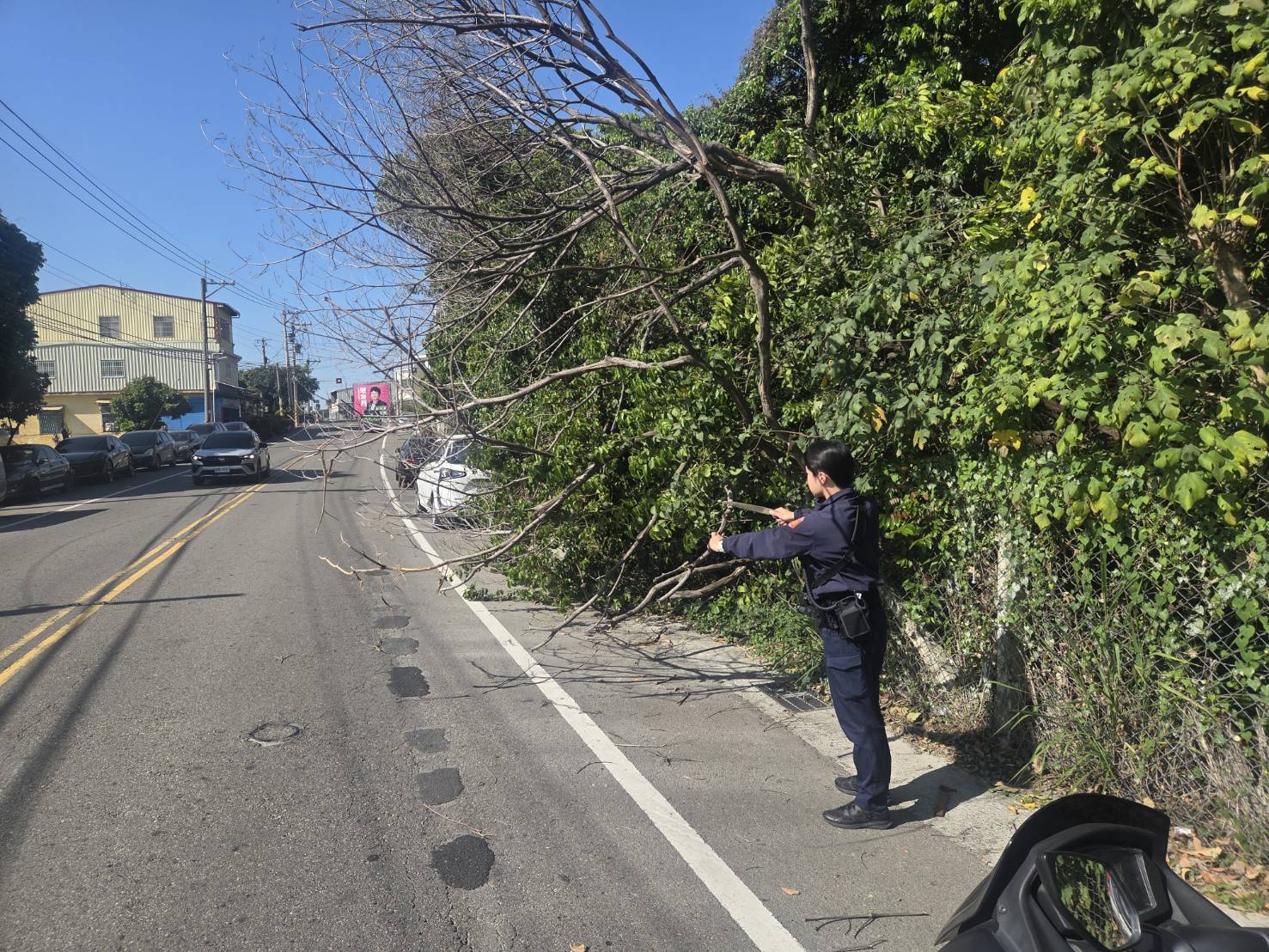 員林分局東山派出所警員郭軒愷於日前執行取締重大違規勤務時,接獲民眾報案,表示員林市山腳路四段附近旁有樹木倒塌,部分枝幹伸入道路,影響車輛通行並有安全疑慮,請警方協助處理。員警獲報後立即前往查看,發現該處樹木倒塌後枝葉占據部分道路,影響往來車輛行駛。員警隨即交通警戒並先行排除立即性危險,使用工具鋸除伸入道路之樹枝,並將掉落枝葉移至路旁,以恢復道路通行安全。 處理過程中,現場亦有熱心民眾主動加入協助,共同清理倒塌樹枝與散落枝葉,在警民合作下迅速完成清理作業,使道路恢復順暢通行,有效避免交通事故發生。另因部分高處樹枝非員警工具所能處理,已通報員林市清潔隊協助後續排除上方未能鋸除之樹枝並進行清運作業。 員林分局表示,警方於勤務中接獲民眾通報後即刻到場處理,迅速排除妨礙交通之障礙物,並結合民力共同維護用路人安全,充分展現警察積極為民服務之精神。員警即時處置、主動協助之作為,不僅維護道路交通安全,也展現警民合作良好典範,對提升警察形象具有正面助益。