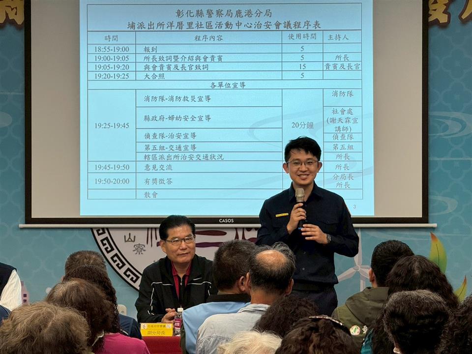為加強轄內村民與員警橫向聯繫,與當地居民直接溝通交流,聽取民眾對治安寶貴意見,共同解決社區的治安問題。鹿港分局於115年3月24日19時在鹿港鎮新厝社區活動中心辦理社區治安會議,本次會議有縣政府顧問郭萬留、縣政府秘書劉俊毓、縣議員施佩妤、縣議員凃淑媚、鎮民代表王麗雯、議員楊妙月助理陳竺均、縣議員楊竣程助理趙磊、郭軒峰、民進黨主委特助施喻琁、里長許勝裕及社區理事長郭正義等人及社區民眾近百人到場共襄盛舉,並同時進行人口販運、識詐及交通安全宣講,宣導民眾遇有疑似人口販運或詐騙案件務必保持冷靜,盡可能記下相關細節,撥打110、165專線請求協助,以獲得警方即時保護。 現場也特別規劃「有獎徵答」活動,並準備精美小禮物,鼓勵村民踴躍參與,加深對治安議題的認識,讓宣導更具互動性與趣味性。 鹿港分局副分局長許平海表示,詐騙事件頻傳,警政署為讓民眾可以更清晰認識詐騙的危害,特以AI科技設立「165打詐儀錶板」網站,定期發布詐騙數據,揭示最新詐騙手法前五名,並連結警政官網、臉書,供民眾瀏覽,提醒民眾勿陷入詐騙陷阱,同時也鼓勵鄉親將相關要點轉知親朋好友、左鄰右舍,讓社區一起努力,共同營造治安、交通安全友善環境。
