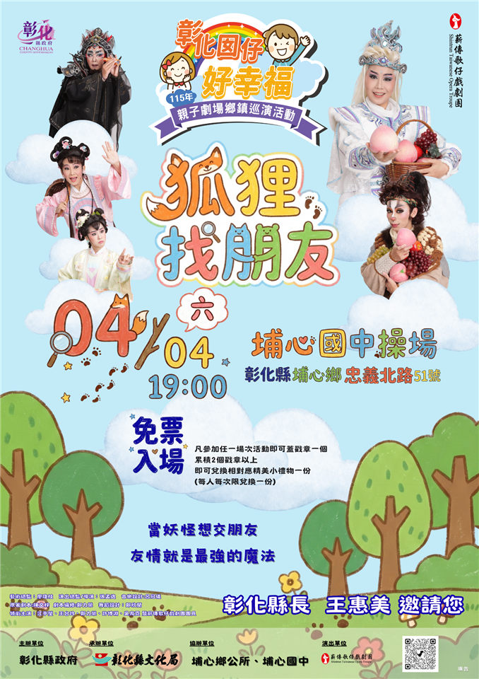 彰化縣文化局精心策劃,深受親子喜愛的「彰化囡仔好幸福—115年親子劇場鄉鎮巡演活動」於4月起熱鬧開演!4月3日下午3點在線西國小、4月4日晚上7點在埔心國中、4月6日下午3點在秀水高工接連登場,彰化縣長王惠美邀請您蒞臨觀賞,一同歡慶兒童節! 巡演首波將於清明連假期間帶來3場精彩演出,4月3日(五)下午3點於線西國小活動中心,由彰化縣傑出演藝團隊「萍蓬草劇團」帶來充滿奇幻冒險的《花忍者》,劇情描述櫻花小學的孩子們誤闖神秘的「茫霧谷」忍者村,他們能否通過層層考驗,完成屬於自己的畢業挑戰呢?一起來見證屬於他們的勇氣與成長! 接著於4月4日(六)晚上7點,在埔心國中操場由Taiwan Top演藝團隊「薪傳歌仔戲劇團」帶來戶外大型公演《狐狸找朋友》。薪傳歌仔戲劇團由歌仔戲國寶級藝師廖瓊枝老師創立,長年致力於歌仔戲藝術的傳承與人才培育,並以優美唱腔與細膩身段聞名。故事描述狐狸妖怪—玉面狐渴望與人類建立友誼,一次偶遇讓他與高家姊妹建立起信任關係,卻在身份揭露後遭受懷疑,他該如何用真誠挽回友誼呢?精湛優質兒童歌仔戲千萬別錯過! 第三場則於4月6日(一)下午3點在秀水高工活動中心登場,由深耕兒童戲劇近三十年的蘋果劇團帶來《發糕與臭臭的奇幻冒險》。蘋果劇團以寓教於樂的歌舞劇形式聞名,劇情描述臘腸狗發糕和他的玩偶臭臭在海邊迷路後誤闖神秘洞窟,路途中遇見奇怪的煤球精靈和神祕狗哥⋯⋯歡迎小朋友一起來欣賞,猜猜發糕能順利找到回家的路嗎? 彰化縣文化局自113年起將兒童劇轉型為「親子劇場」,即是希望透過更多元的戲劇型態,創造親子共賞精緻藝術演出的美好時光,讓孩子培養想像力與美感經驗,留下難忘的成長記憶。「115年親子劇場鄉鎮巡演」將自4月3日起至5月23日陸續登場,共計10場次,活動一律免票入場,每場演出現場可蓋戳章1個,累積2個戳章以上可兌換相對應精美禮品1份,每人每次限兌換1份,送完為止。誠摯邀請家長在兒童節期間帶著孩子一同欣賞精彩演出,共同創造美好回憶。