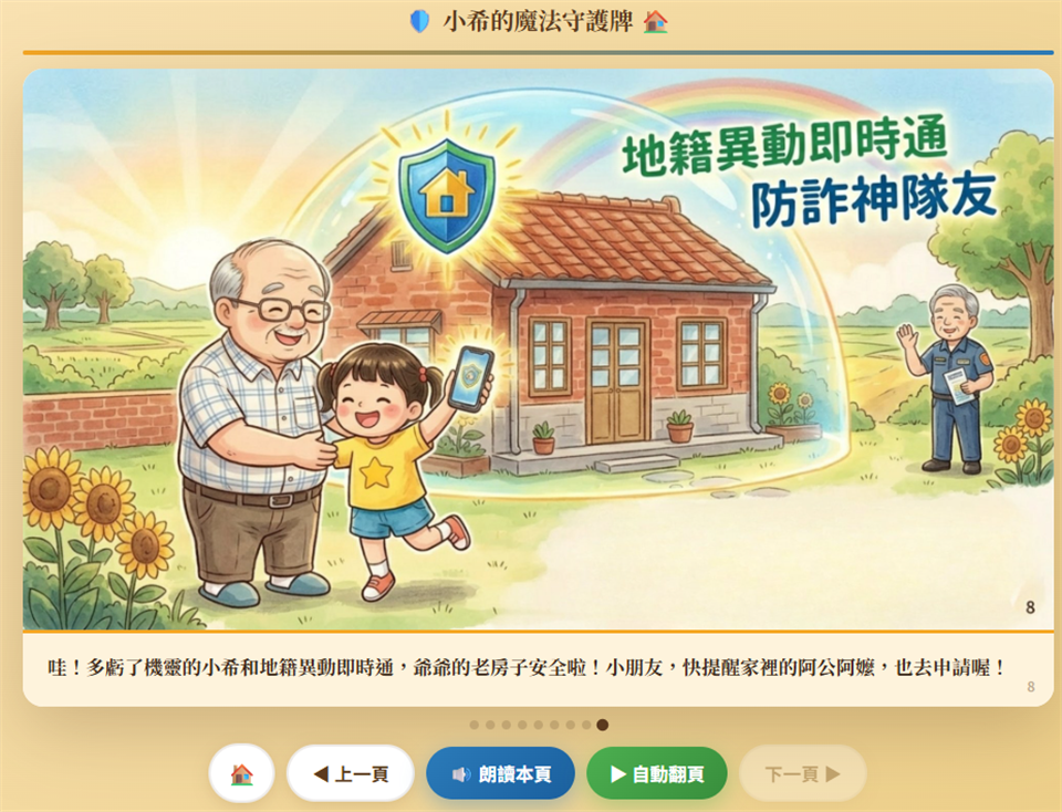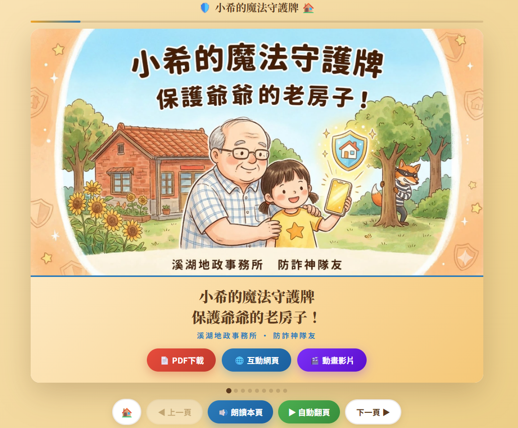 溪湖地政事務所推出結合防詐騙宣導與親子閱讀之數位繪本「小希故事書」,以寓教於樂方式,提升民眾對不動產交易安全及財產保護之重視,並藉由多元數位媒介,擴大宣導效益。 該所本次推出之「小希故事書」,以原創角色「小希」為主軸,透過生動故事情節,引導大小朋友認識常見詐騙手法,並傳達保護不動產的重要觀念。故事內容描述小希運用智慧,成功阻止不法人士侵害家產,寓意民眾可透過正確工具及資訊,守護自身財產安全。 本繪本線上閱讀平台(https://myppt.cc/Kd0THv)提供即時瀏覽功能,民眾僅需透過手機、平板或電腦連結即可免費閱讀,操作簡便,無須下載即可快速開啟。平台除支援翻頁閱讀與畫面放大檢視外,並建置語音閱讀功能,透過清晰標準之配音導讀,協助兒童自行聆聽學習,亦便利家長陪同共讀;語音播放可依需求暫停或重播,提升閱讀彈性與使用便利性。另具分享機制,方便學校、社區及機關團體於防詐宣導活動中運用,強化數位教材之推廣效益與觸及層面。 溪湖地政事務所黃麗卿主任呼籲,防範詐騙須從日常生活做起,透過親子共讀及數位學習,可有效提升家庭整體防詐意識,未來將持續結合創新宣導方式與數位工具,深化地政服務內涵,提升民眾對相關政策之認識與使用率,發揮在地服務之功能。 業務單位:溪湖地政事務所 聯 絡 人:吳小姐 電 話:8813119#204