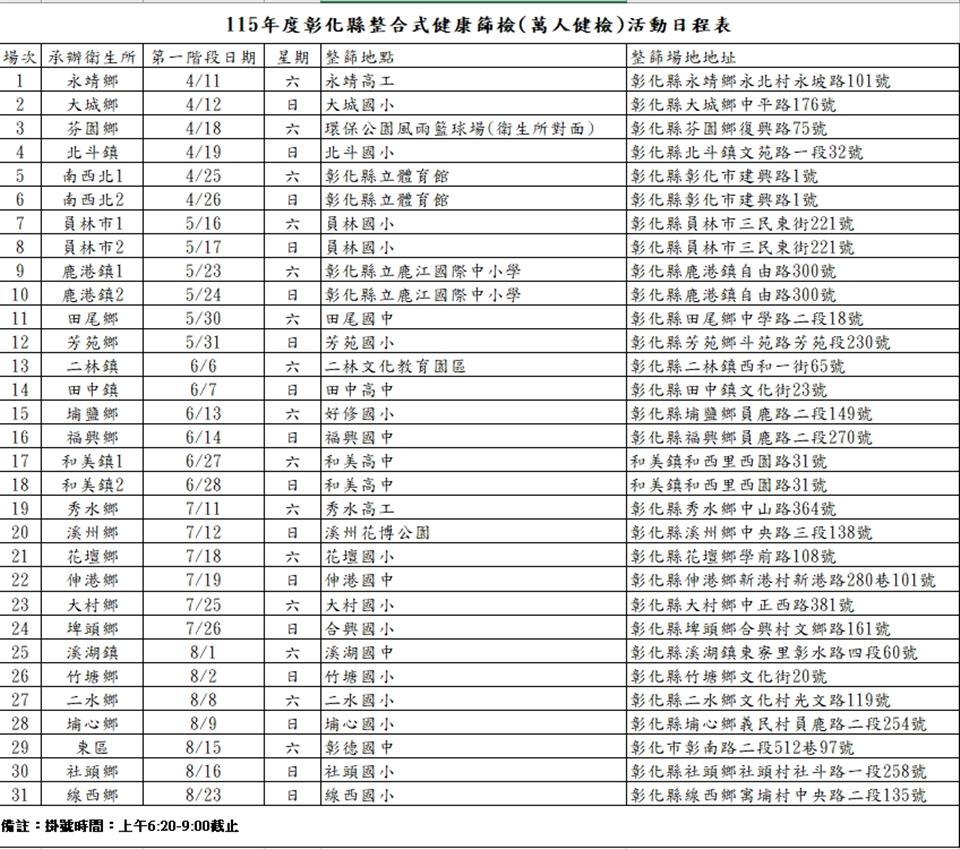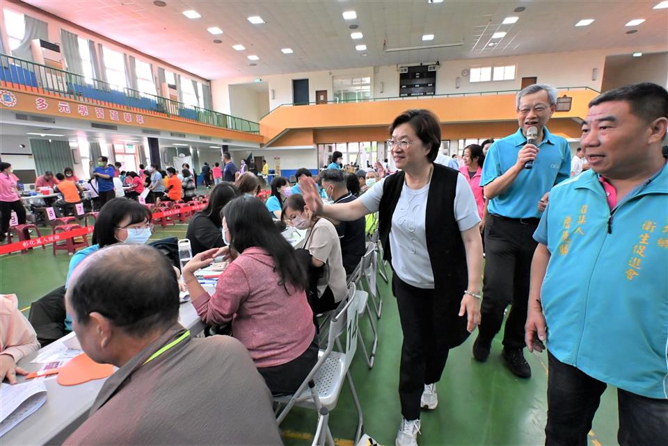 為提升縣民健康意識並落實疾病早期發現,彰化縣政府持續推動萬人健檢活動,今(115)年首場於4月11日上午在永靖高工登場。彰化縣長王惠美親臨活動現場關心鄉親健康,並號召民眾踴躍參與篩檢,及早掌握自身健康狀況。萬人健檢活動邁入第22年,今年在全縣26鄉鎮市辦理31場次,每年皆有超過上萬人次共襄盛舉。 王縣長表示,透過整合式篩檢服務,民眾一次即可完成健康檢查及多項癌症篩檢,約1小時就可能完成10幾項檢查,不僅節省時間,也提高便利性。檢查完成2週後回來看報告,如有狀況及早介入處理,彰化有豐富的醫療資源與團隊為大家提供最好的服務,做好日常維護及保持運動習慣就能提升健康餘命與生活品質。 王縣長指出,縣府透過萬人健檢活動,推廣「早期發現、早期治療」,這也是預防癌症最有效的方法。現在做癌篩就送禮劵,符合資格並完成篩檢,每完成1項即可獲得100元健康禮券,最高可領700元,歡迎大家把握機會。健康是最重要的資產,邀請大家為共同守護自己與家人的健康。 彰化縣衛生局表示,凡設籍彰化縣,年滿40歲以上且3年內未接受成人健康檢查者同時符合子宮頸癌、大腸直腸癌、乳癌或口腔癌任一篩檢資格者,或女性年滿30歲以上且3年以上未做或從未接受子宮頸抹片檢查者,均可向所在地衛生所報名參加。 今年縣府持續推動「癌症篩檢禮券獎勵措施」,凡設籍彰化縣且符合國民健康署癌症篩檢資格的民眾,即日起至115年12月31日止,於縣內28家醫院、127家診所、27家衛生所及設站篩檢完成子宮頸癌、乳癌、大腸直腸癌、口腔癌、肺癌、胃癌及B、C型肝炎篩檢,可獲得健康禮券。此外在萬人健檢活動現場完成子宮頸抹片檢查及成人健檢加值B、C型肝炎篩檢者,可當場領取禮券;其餘如口腔癌篩檢、糞便潛血檢查、胃幽門桿菌檢查及乳房攝影檢查,則於後續解說報告時發放。鼓勵民眾定期篩檢、及早預防,共同打造樂活健康的「美好彰化 希望城市」。 與會貴賓還有永靖鄉民代表會主席林致安、永靖鄉衛生促進委員會召集人詹德勝、衛生福利部彰化醫院院長賴仲亮 、彰化縣衛生局長葉彥伯、各級民代與地方仕紳等人。