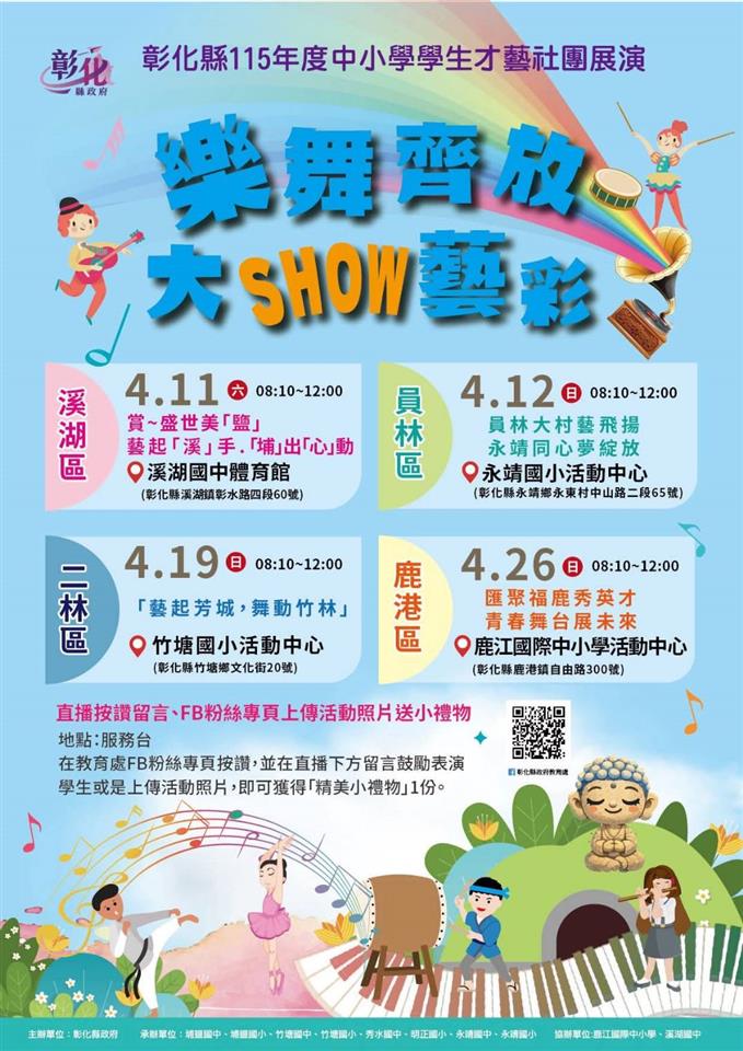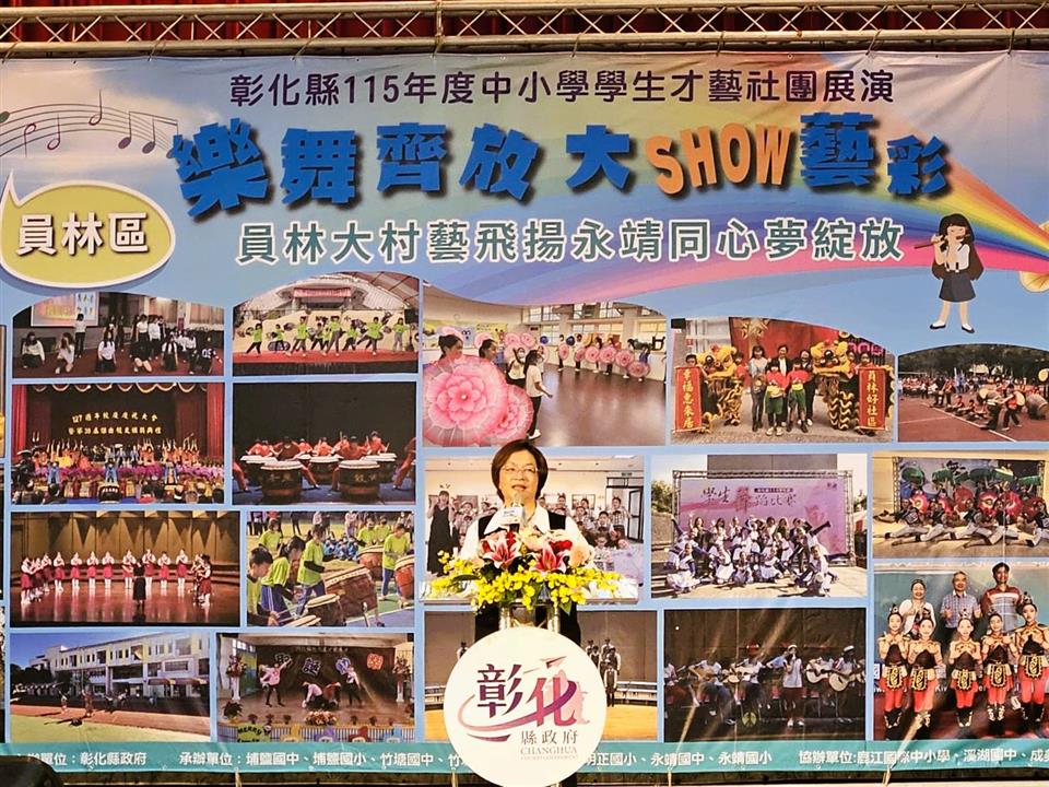 彰化縣政府推動多元學習與藝文教育成果盡顯!4月12日於永靖國小舉辦「115年度中小學學生才藝社團展演」第二場,縣長王惠美出席與鄉親一同欣賞學生精彩演出。此次活動結合員林、大村、永靖三地特色,以「員林大村藝飛揚,永靖同心夢綻放」為主題,各校社團輪番上陣,現場氣氛熱烈,充分展現彰化學子學習成果與青春活力。後續展演活動將於4月19日於竹塘國小(二林區)、4月26日於鹿江國際中小學(鹿港區)接續辦理,邀請鄉親踴躍參與,一同見證彰化學子多元學習成果。 本次展演內容豐富多元,涵蓋國樂、太鼓、武術及民俗舞蹈等類型,學生們在舞台上自信展現學習成果,正是縣府長期推動「一校一社團」政策的具體展現。透過多元社團發展,引領孩子探索興趣、培養專長,進而建立自信,找到屬於自己的舞台。 教育是百年大計,縣府秉持「再窮,不能窮教育;再苦,不能苦孩子」理念,持續推動校園翻轉工程,從校舍耐震補強、場館整建到校園環境優化,全面提升學習空間品質,打造安全、舒適且具現代化機能的優質校園,為孩子奠定良好成長基礎。除強化硬體建設外,也同步提升教育軟實力,透過「美域.美育」計畫營造美感校園,推動英語國際村、AI情境英語教學並引進外籍師資,培養學生國際視野與未來競爭力,引領彰化孩子從在地出發、走向國際。 王縣長感謝議長謝典霖及所有議員對教育預算的支持,以及各校校長、教師、家長會與志工長期付出與陪伴,讓孩子在良好環境中安心學習、快樂成長,在多元舞台上展現自我、發光發熱。 教育處表示,本次活動由員林、大村、永靖地區多所學校社團接力演出,內容涵蓋國樂、直笛、太鼓、合唱、武術、民俗舞蹈、吉他及流行舞等,展現學生多元才藝。