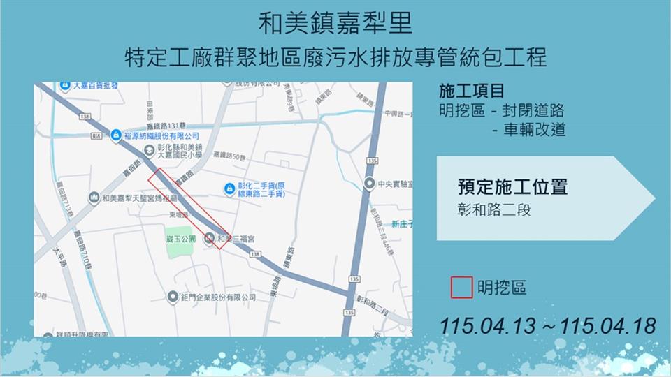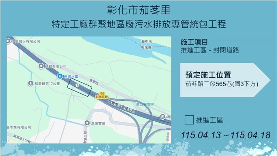 彰化縣政府水利資源處於彰化市茄苳里及和美鎮嘉犁里進行特定工廠污水排放專管建設工程,於115年4月13日至115年4月18日預定施工範圍及管線施工路段,如圖示,工程採分段分區方式施工,相關期程將視現場施工情形調整,部分路段實施車道分流及縮減,敬請多加小心! 1、 彰化縣彰化市茄苳里特定工廠群聚地區廢污水排放專管統包工程,將於於茄苳路二段565巷(國三交流道下方)進行推進作業。 2、 彰化縣和美鎮嘉犁里特定工廠群聚地區廢污水排放專管統包工程,將於彰和路二段進行明挖作業。