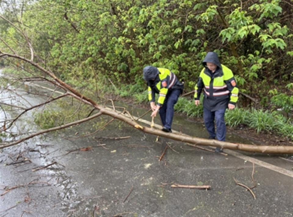 日前因連續豪雨來襲,伸港分駐所員警接獲民眾報案於伸港鄉東興路與東全路口有大樹倒塌阻礙道路,和美分局伸港所員警於執行勤務期間,發現路旁大樹木疑因風雨影響傾倒,占據部分道路,影響車輛通行安全,適逢傾盆大雨又逢假日,無相關單位協助排除。 警方見狀立即下車交通疏導並避免往來車輛因天雨路滑及視線不佳發生危險,隨即冒著大雨於現場疏導交通並徒手排除沉重的倒塌大樹,將障礙物移置路旁,迅速恢復道路通行,確保用路人行車安全。 天候不穩定,強風豪雨易造成樹木倒塌或道路受阻情形,呼籲用路人行車時應減速慢行並隨時留意前方路況,如遇交通管制或道路受阻情形,務必配合警方指揮改道通行,以確保行車安全。