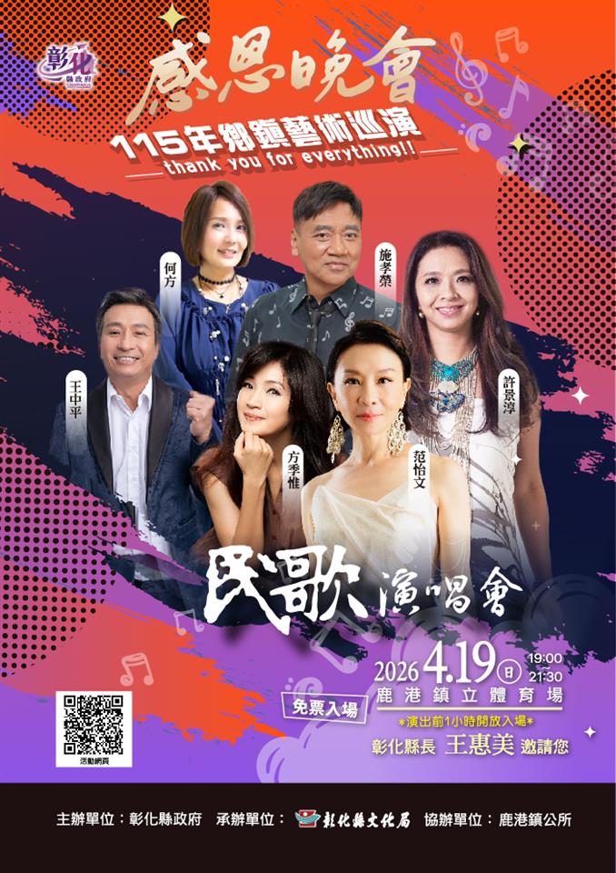 彰化縣政府持續推動藝文下鄉,115年「感恩晚會-鄉鎮藝術巡演」自4月起熱鬧展開,4月18日及19日將於鹿港鎮立體育場連續兩天晚上7時舉辦大型戶外演出,分別邀請優人神鼓帶來《踏風而行》,以及多位知名歌手共同演出民歌演唱會,以截然不同的藝術形式,為民眾呈現兼具震撼與溫度的藝文饗宴,皆免票入場。縣長王惠美邀請鄉親把握機會,一同沉浸於春夜的藝文氣息。 4月18日晚間演出節目《踏風而行》,由國際知名表演藝術團隊優人神鼓擔綱演出。該團隊以融合擊鼓、武術、舞蹈與靜坐修練聞名,其創作強調身心合一與內在覺察,透過節奏與肢體語彙展現東方哲學精神。《踏風而行》以「行進」為概念,透過鼓聲的層層推進與身體的律動轉換,呈現人在天地之間行走、探索與自我對話的過程。作品在動與靜之間取得平衡,時而磅礡震撼、時而沉靜內斂,帶領觀眾進入一段富含精神性的藝術旅程。 緊接於4月19日晚間登場的民歌演唱會,轉以音樂帶動情感共鳴,邀請許景淳、方季惟、王中平、范怡文、何方及施孝榮等多位實力派歌手接力獻唱。透過多首耳熟能詳的經典曲目,帶領觀眾回望臺灣民歌發展歷程,喚起跨世代共同的文化記憶。 彰化縣政府表示,「感恩晚會-鄉鎮藝術巡演」以文化共享與藝術平權為核心理念,透過巡演形式深入各鄉鎮,讓優質藝文節目不再侷限於場館,而能走入民眾日常生活。今年巡演節目內容橫跨傳統戲曲、音樂演出、當代表演藝術等多元類型,滿足不同族群的觀賞需求,也讓藝術成為連結社區的重要媒介。鹿港作為歷史文化重鎮,累積深厚人文底蘊,此次連續兩晚於鹿港鎮立體育場演出,別具意義。開放式戶外場域不僅提供更親近的觀演距離,也讓表演與城市空間融合,使藝術走出舞台,成為生活的一部分。隨著夜幕低垂、燈光亮起,觀眾在微風與星空下欣賞演出,將帶來不同於室內的觀賞經驗。 誠摯邀請民眾於4月18日、19日晚間走入鹿港鎮立體育場,親身感受鼓聲與歌聲交織的藝術魅力。相關活動資訊請上文化局官網查詢:https://reurl.cc/bdVYdE