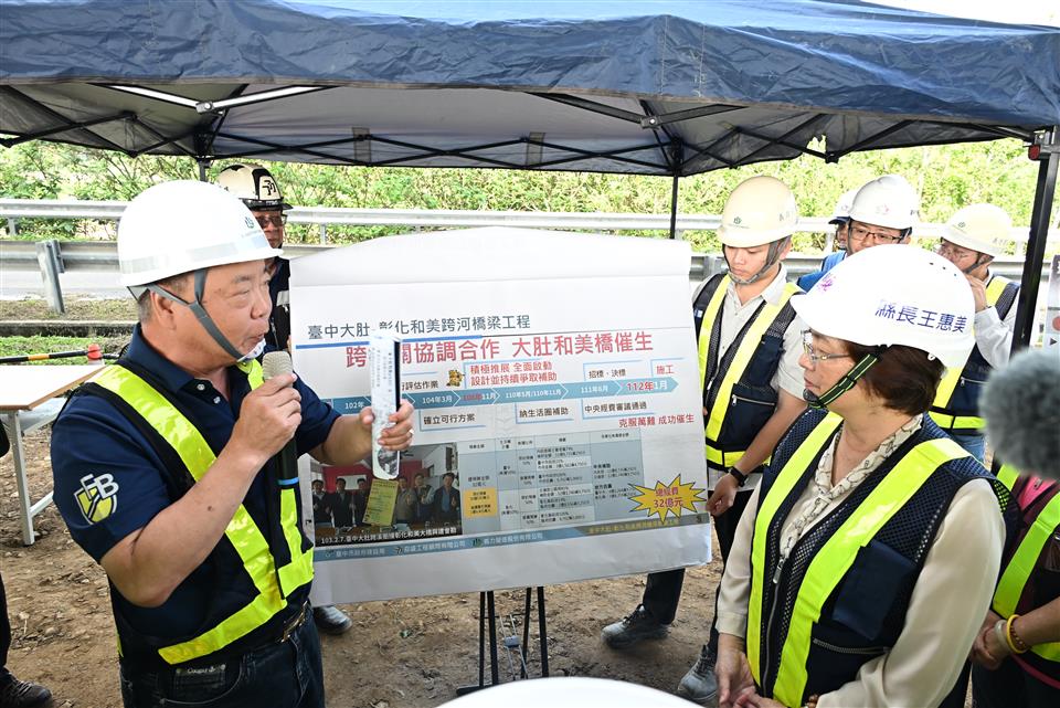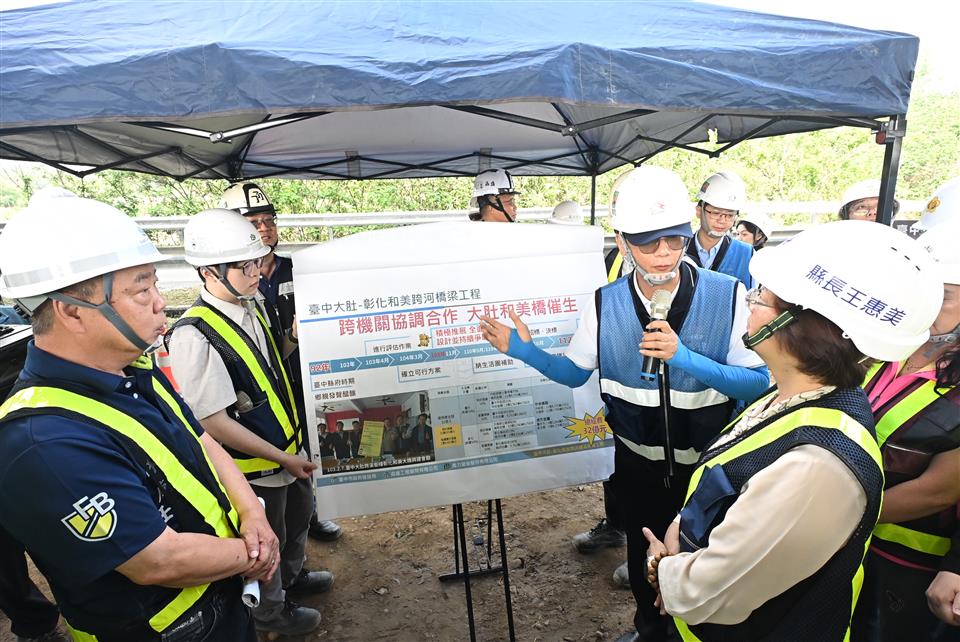 彰化縣長王惠美於今(20)日上午在縣府主管同仁陪同下,與臺中市政府、多位議員共同前往和美鎮「臺中大肚-彰化和美跨河橋梁工程」工地,視察施工進度並聽取簡報。王縣長表示,本工程計畫經費約32億元,因橋梁橫跨中彰兩縣市之行政區域,經協議各負擔50%經費約16億元,縣府獲交通部公路局補助約12.17億元,在議長謝典霖及所有議員對預算的支持下,縣府自籌約3.83億元。工程由臺中市政府代辦,自112年1月31日開工,預計115年10月底開放通車。 王縣長表示,從擔任立委時期就積極推動這項工程,本工程自臺中大肚南接彰化和美,全長約1,690公尺,其中主橋長達1,440公尺,橋寬22公尺,設有雙向4車道、2機車道及人行與自行車的共用道。工程自開工以來,進度持續超前,整體進度已近89%。感謝臺中市承攬施工重任,肯定施工團隊效率並兼顧工安,期盼儘速竣工並順利通車。 王縣長指出,完工後不僅能大幅提升臺中與彰化之間的交通功能,並串聯國道1號、國道3號、台74環狀線以及台61線,能有效紓解大度橋和中彰大橋的壅塞情形,也能落實「中彰30分鐘生活圈」目標。往來彰化臺中通行橋梁最快僅需2分鐘,大幅縮短通行時間。 和美鎮長林庚壬表示,感謝臺中市政府及彰化縣政府共同打造大肚和美橋,讓交通變得更通暢快速。 臺中市政府建設局總工程司陳建權表示,目前工程朝既定期程穩定超前,預計今年10月底通車,原本大肚到和美30分鐘,未來2分鐘就可到達,地方經濟與交通日後會更加發展。感謝王縣長,以及中央包括內政部、交通部的補助,更感謝台中市盧市長的用心,完成20年來地方的期待。 工務處表示,本計畫自臺中大肚端文昌路二段出發,跨越烏溪,南接彰化和美,銜接省道台61乙線,有效紓解大度橋及中彰大橋交通壅塞。本次視察集合於「國道三號橋下晉北路486巷路口」,原規劃增設中央分隔島並封閉既有村里聯絡道,經民眾反映後,縣府邀集相關單位研議,保留原路口通行功能。未來將視車流量及交通狀況,由管理單位再行評估是否封閉或增設分隔島。縣府將持續完善交通路網,帶動區域發展,打造彰化成為宜居宜遊的「美好彰化 希望城市」。 與會貴賓有縣議員林小琪、周君綾、賴清美、柯振杯、蕭文雄、和美鎮長林庚壬、和美鎮民代表會主席周保方、臺中市政府建設局總工程司陳建權、縣府參議柯呈枋、新聞處長李俊德、各級民意代表與地方仕紳等。